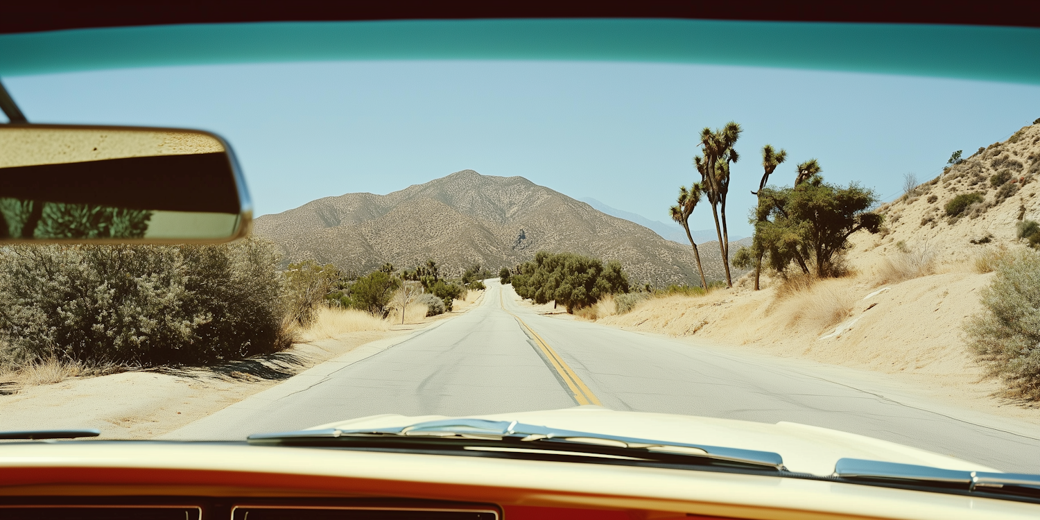 View from a car windshield of a desert road lined with Joshua trees, leading to distant mountains under a clear blue sky.
