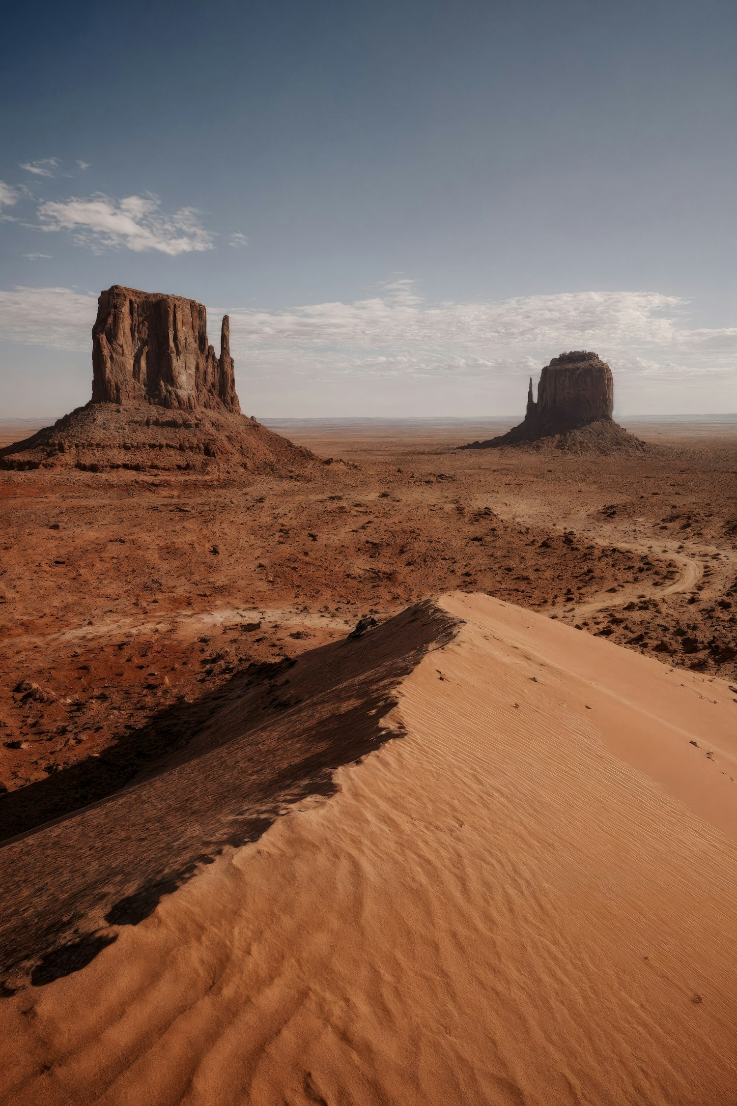 Stunning desert view with towering sandstone buttes, rippled sand dunes, and a vast blue sky with scattered clouds.