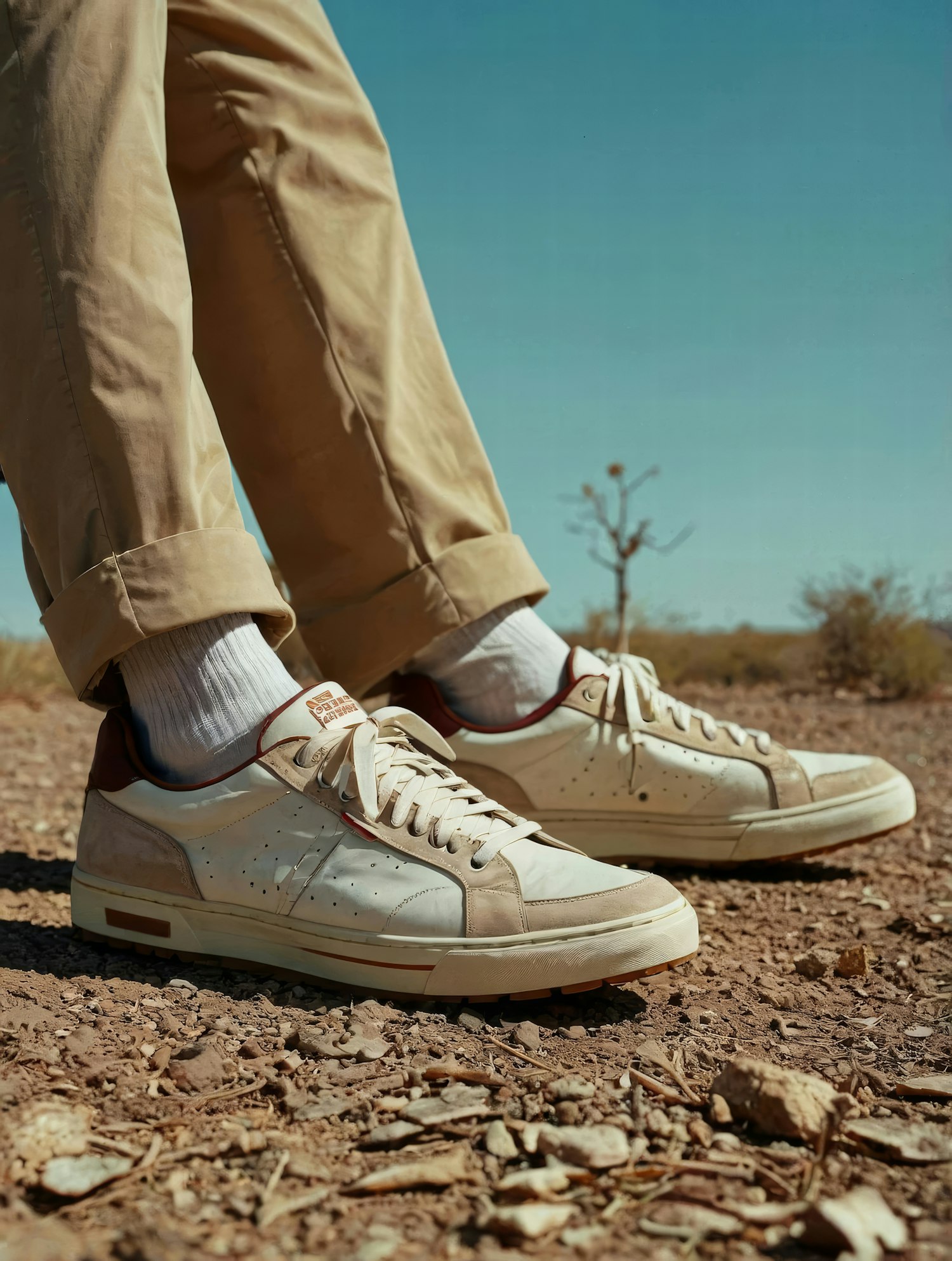 Stylish beige and white sneakers on rocky desert terrain, paired with khaki pants and white socks under a clear blue sky.
