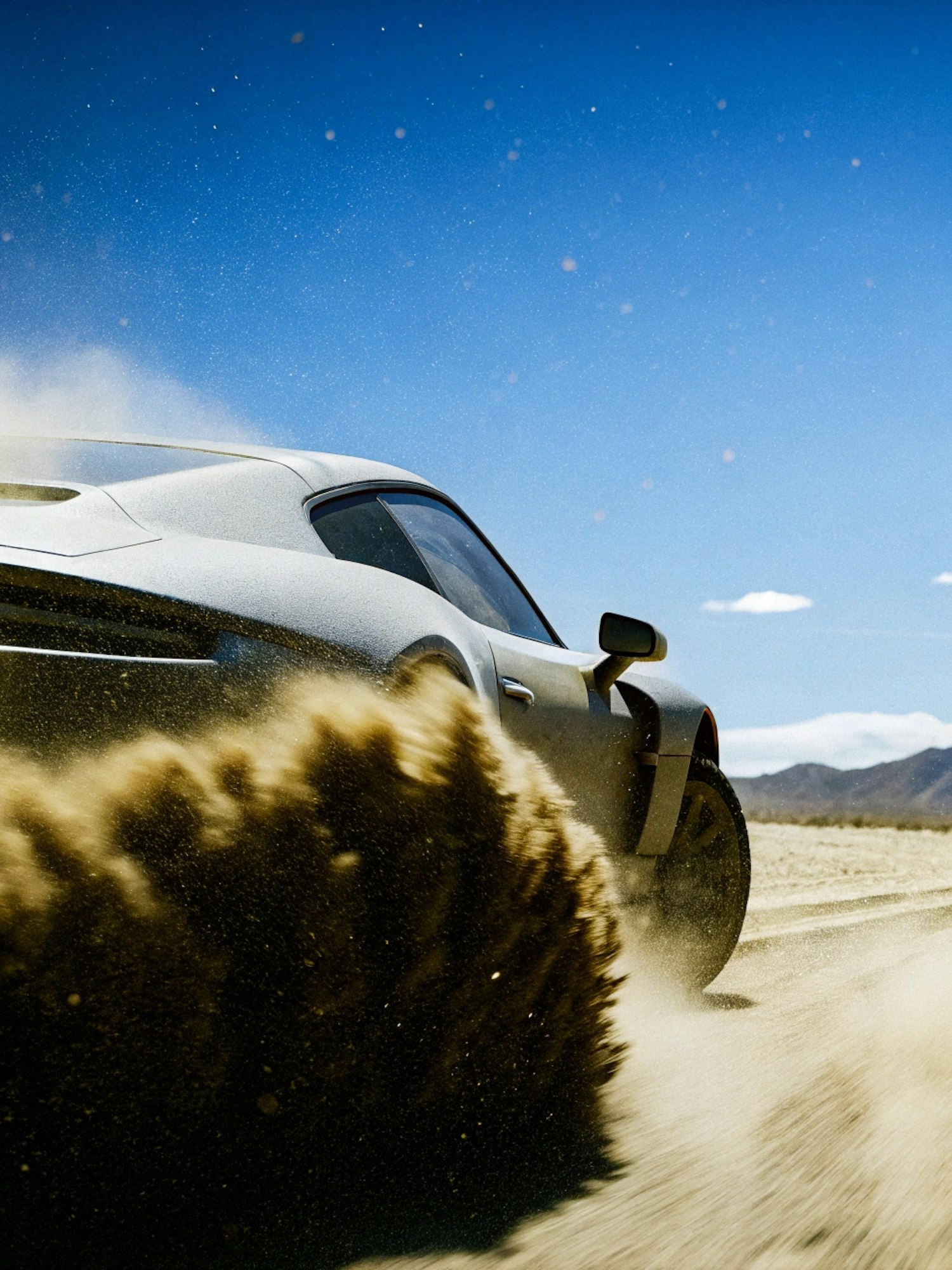 A sports car speeds through a desert, kicking up sand under a clear blue sky, showcasing its sleek design and dynamic motion.
