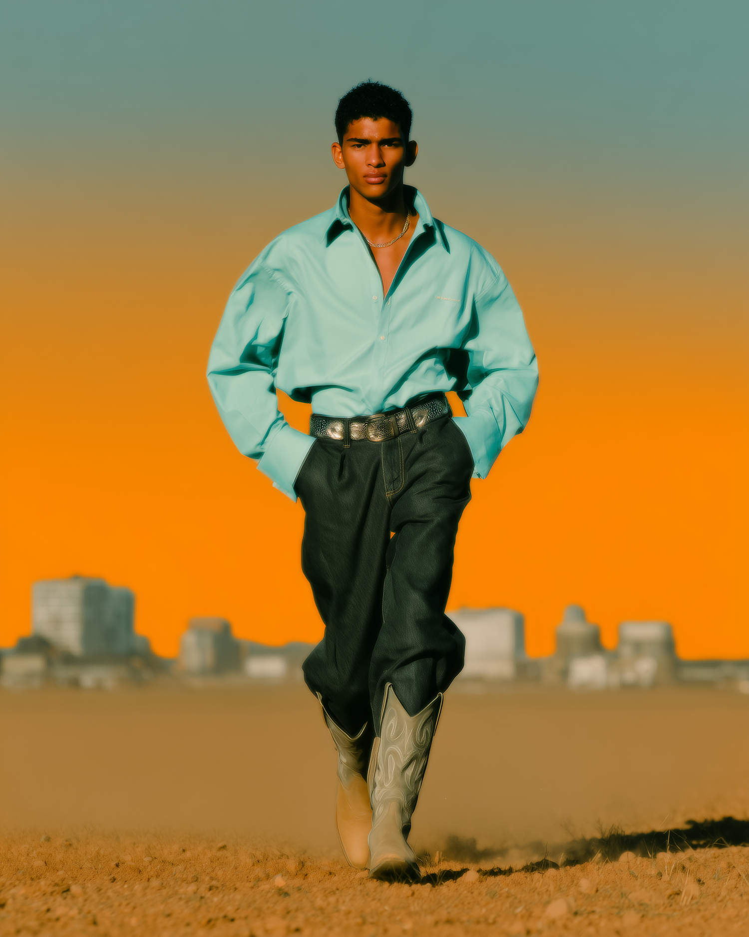A stylish individual in a turquoise shirt and cowboy boots walks in a desert setting with a vibrant orange sky and cityscape in the background.