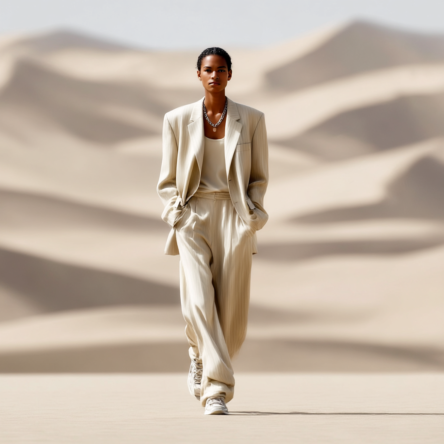 A stylish individual in a beige suit walks through a serene desert landscape, blending fashion with the natural beauty of sand dunes.