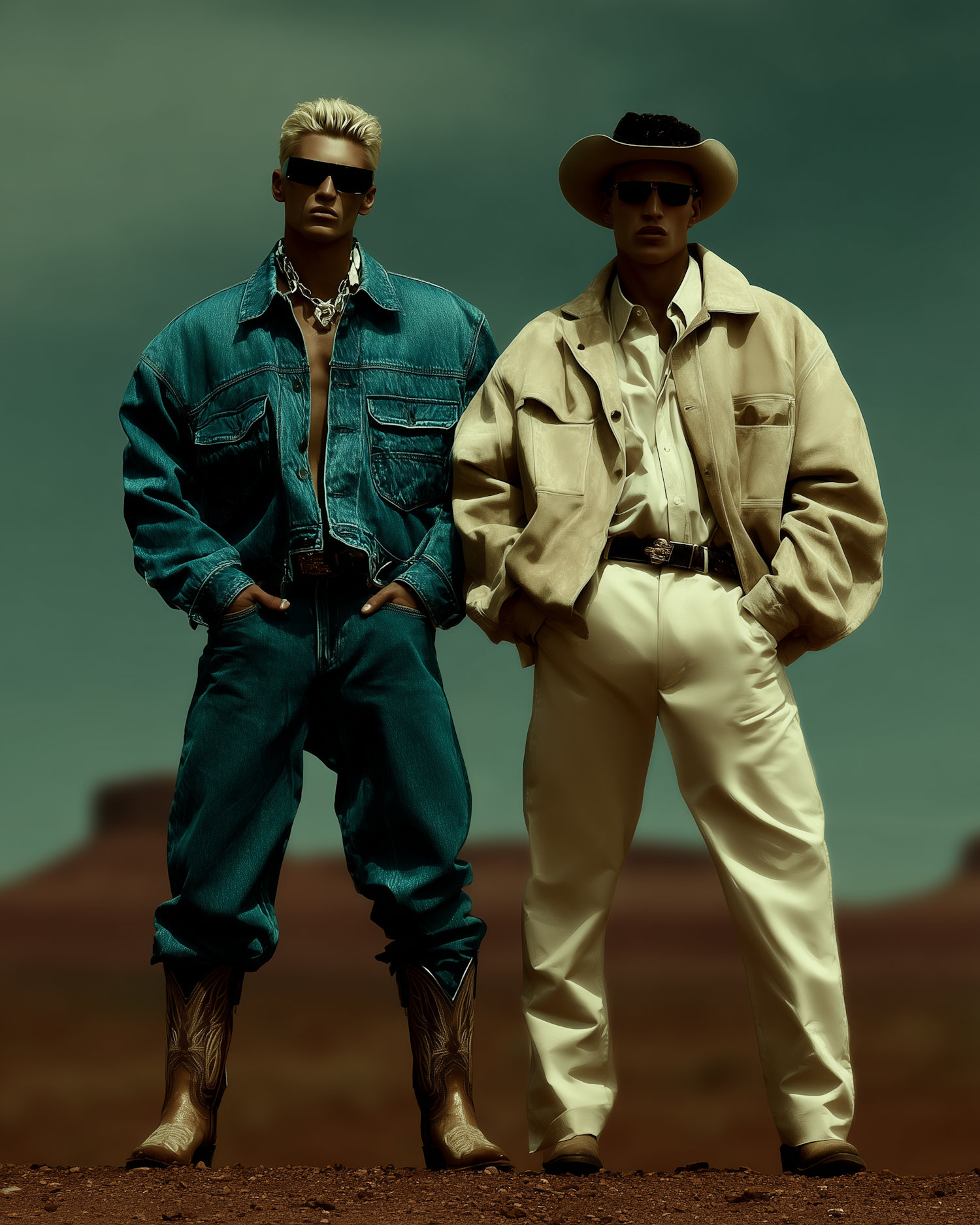 Two stylish individuals in Western-inspired outfits pose in a dramatic desert setting, showcasing bold fashion and a rugged aesthetic.