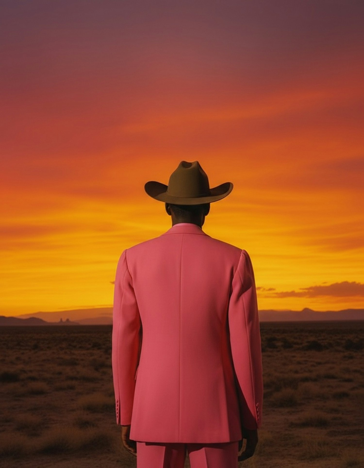 A person in a pink suit and cowboy hat stands in a desert at sunset, with a vibrant orange and purple sky in the background.