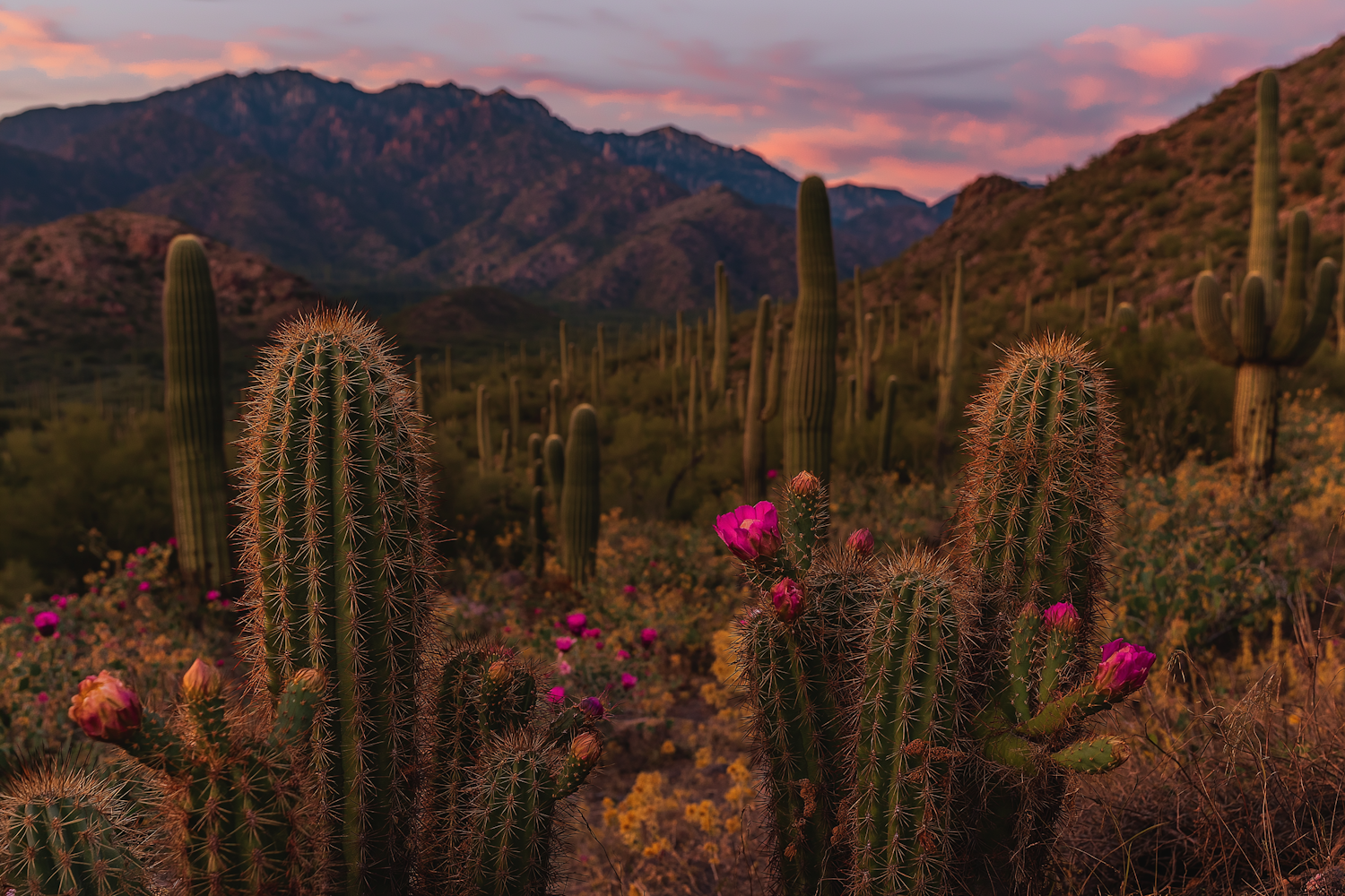 A vibrant sunset casts warm hues over a desert landscape filled with blooming cacti and distant rugged mountains.