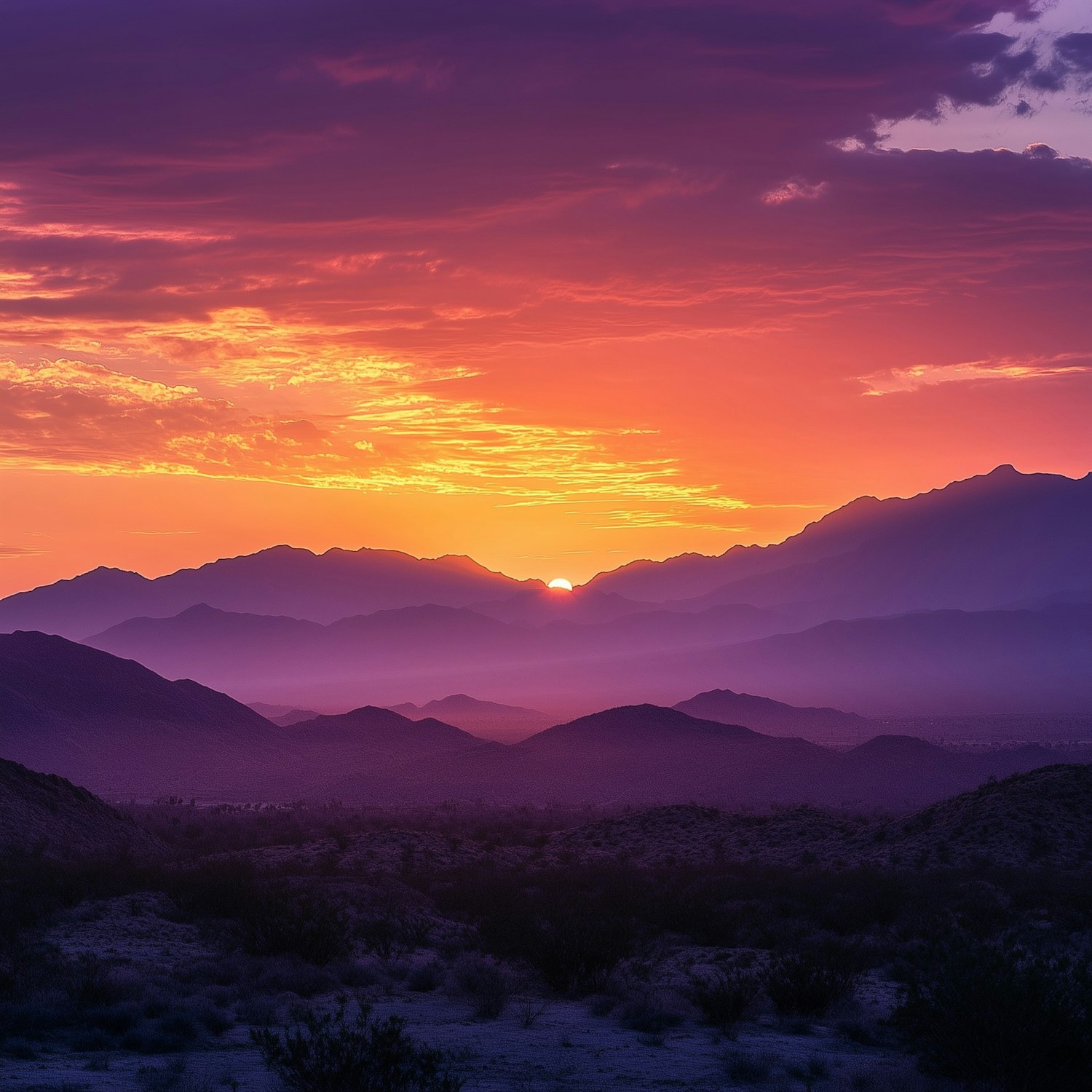 Vivid desert sunset with orange, pink, and purple skies over layered mountain ranges and rugged terrain. A serene and dramatic view.