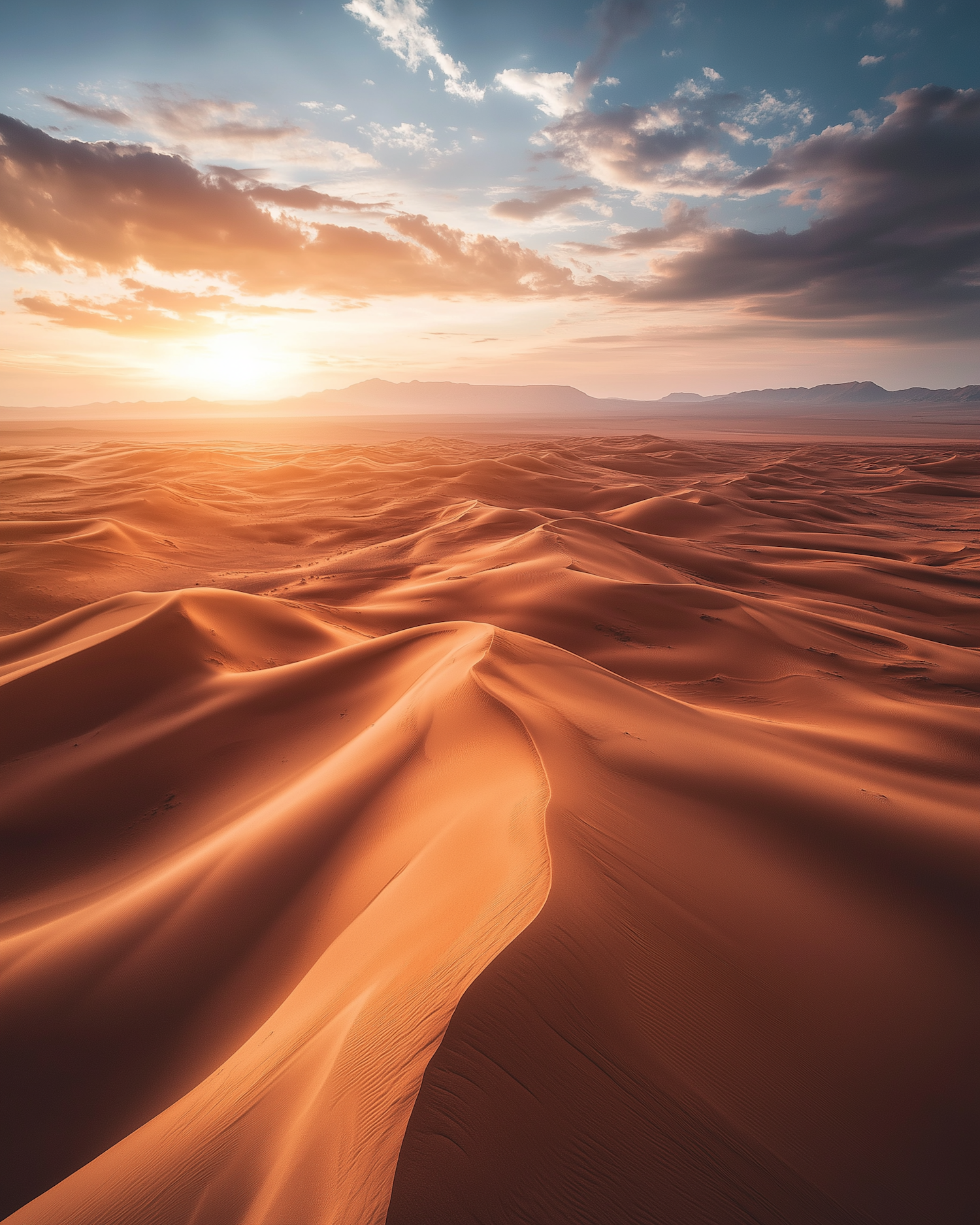 Golden sand dunes under a sunset sky, with mountains in the distance. A serene and majestic desert landscape.