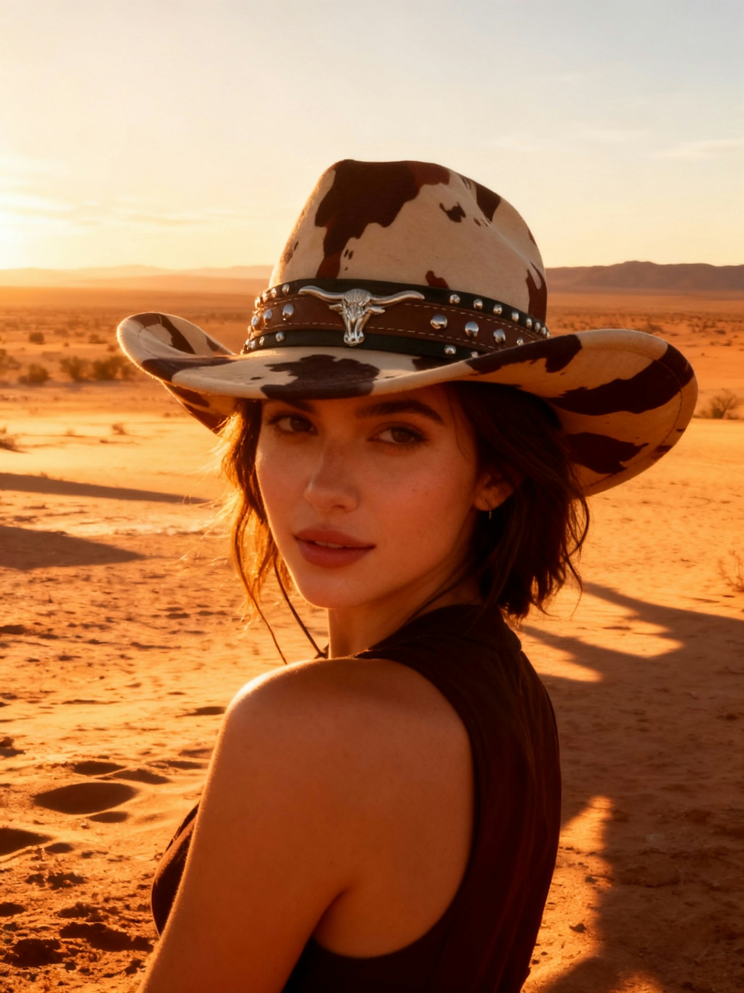 A woman in a cowhide-patterned cowboy hat stands in a desert at sunset, her expression calm and confident, bathed in warm golden light.