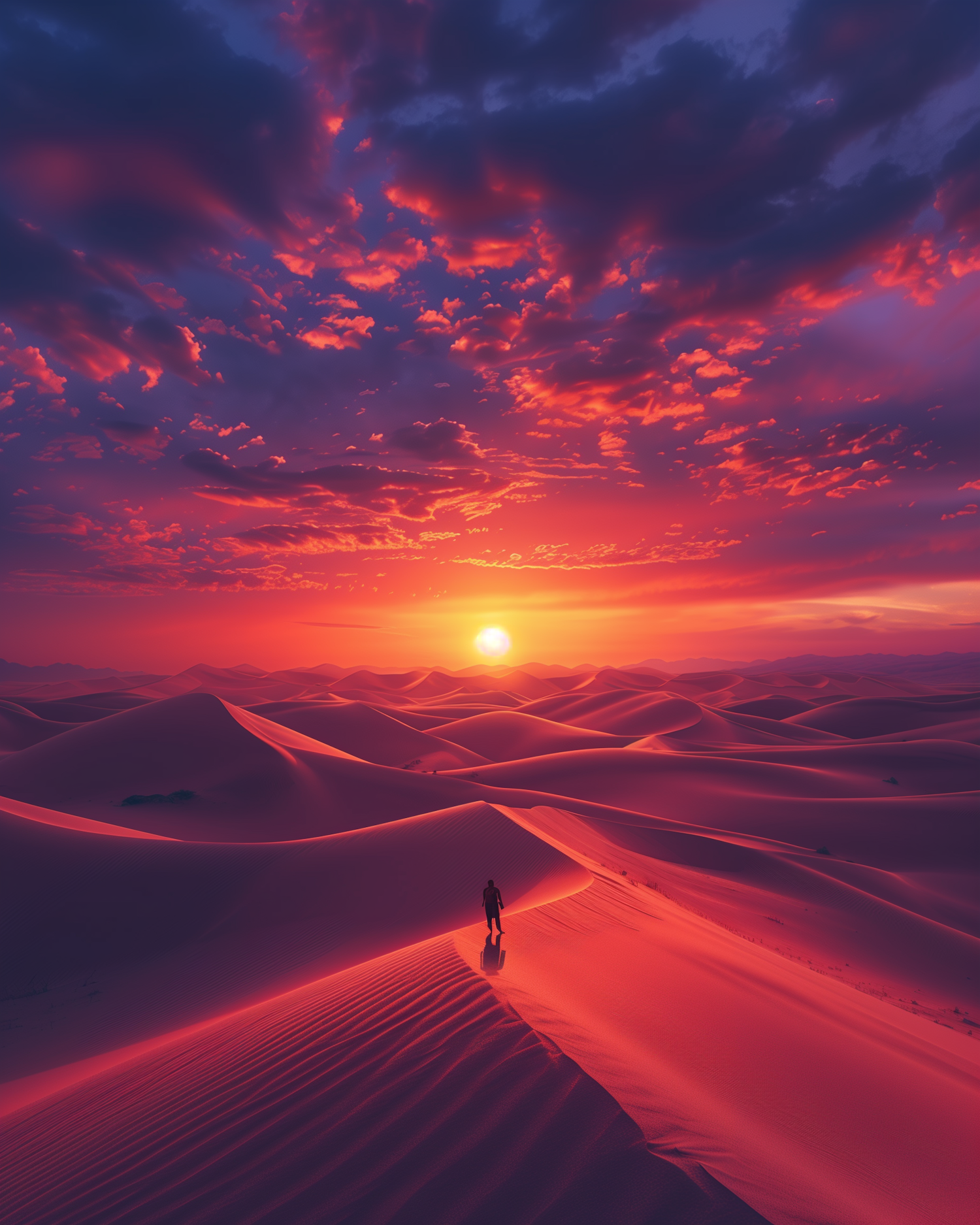A lone figure on a sand dune at sunset, with vibrant red and orange skies casting dramatic shadows over the desert landscape.