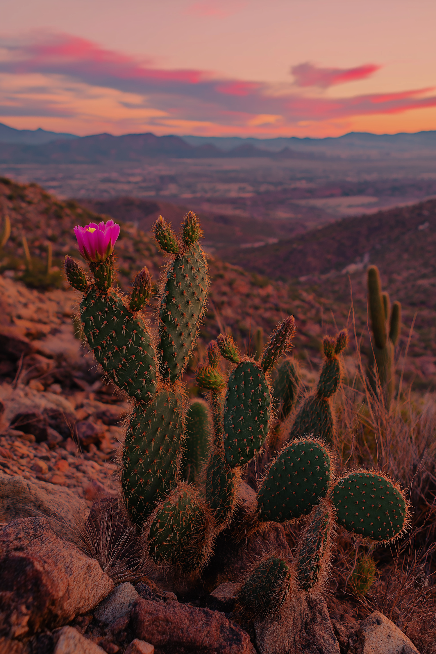 Purple flowering cactus against a backdrop of a colorful sunset over a rugged desert landscape.