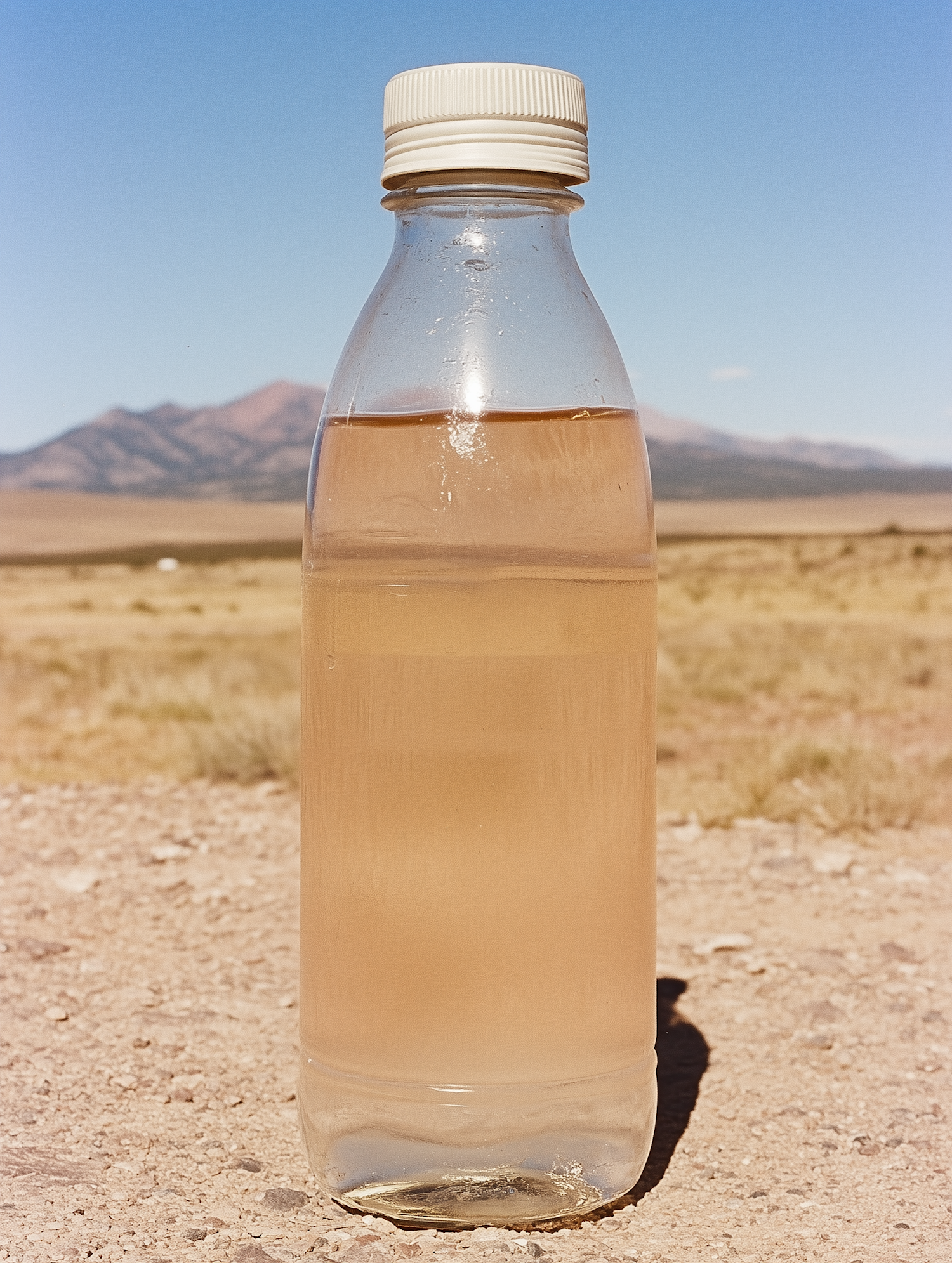 A plastic bottle with murky water sits on a dry, rocky surface in a desert landscape with mountains in the background.