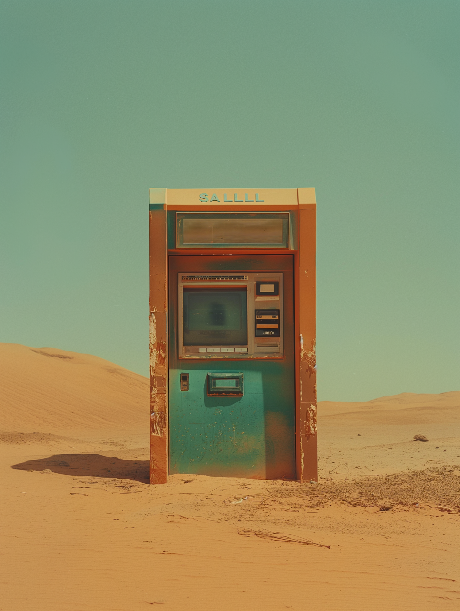 A weathered ATM stands alone in a vast desert, surrounded by sand dunes under a clear blue sky, creating a surreal and intriguing scene.