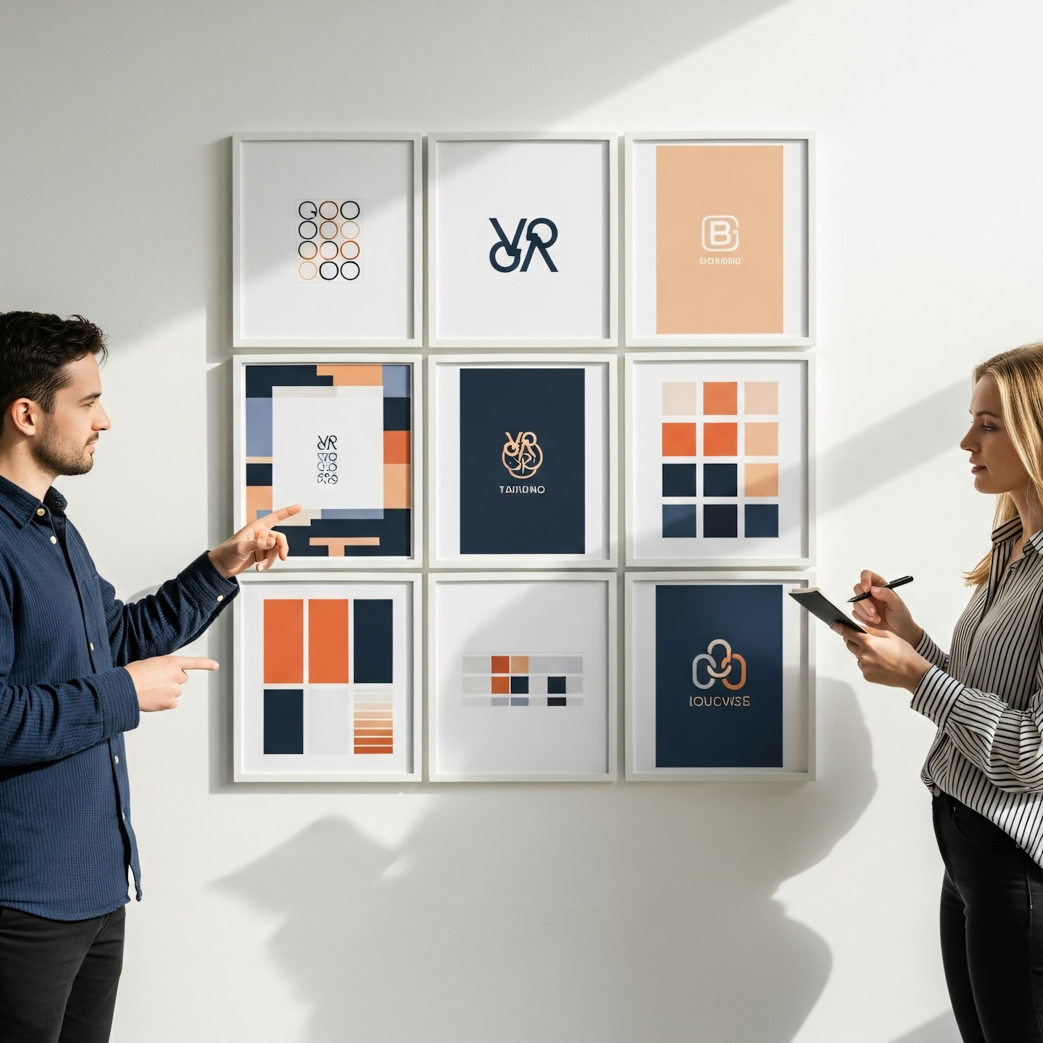 Two professionals discuss modern graphic designs displayed on a wall, featuring abstract patterns and logos in a stylish color palette.