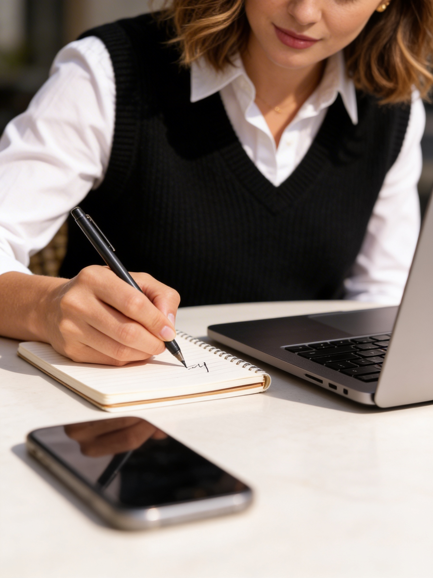 A person writing in a notebook at a desk with a laptop and smartphone, dressed in a white shirt and black sweater vest.