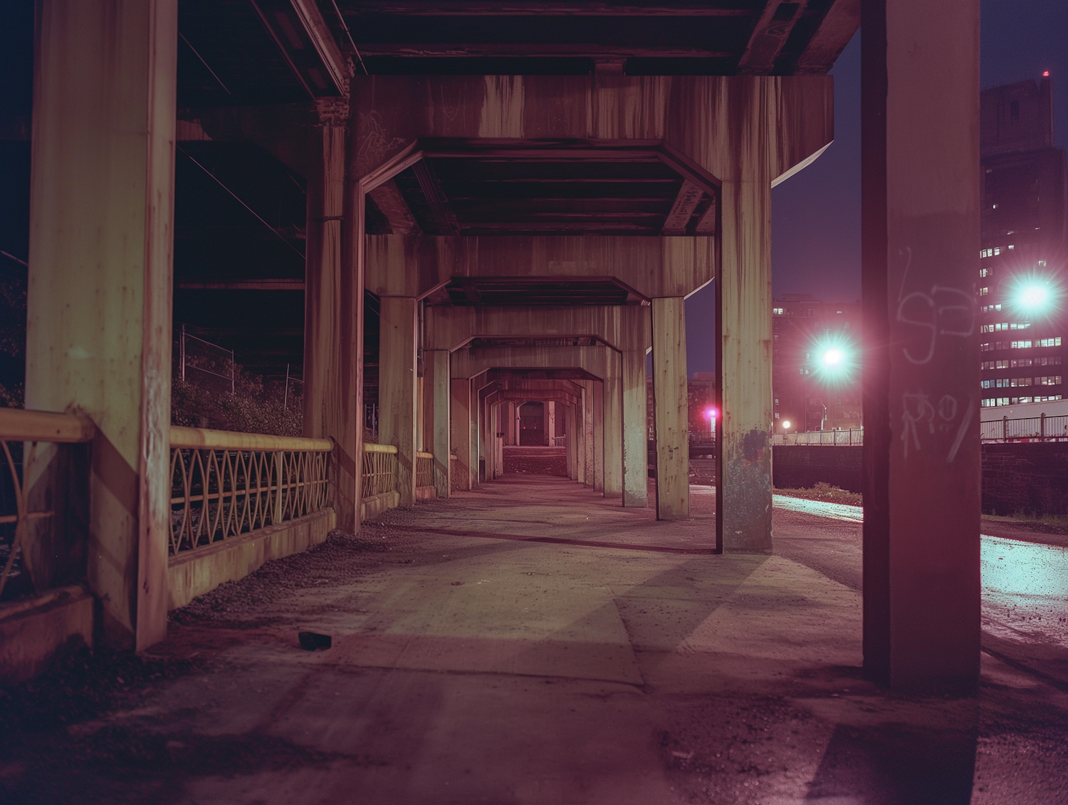 Moody urban underpass at night with rusted beams, graffiti, and city lights in the background, creating a tunnel-like effect.
