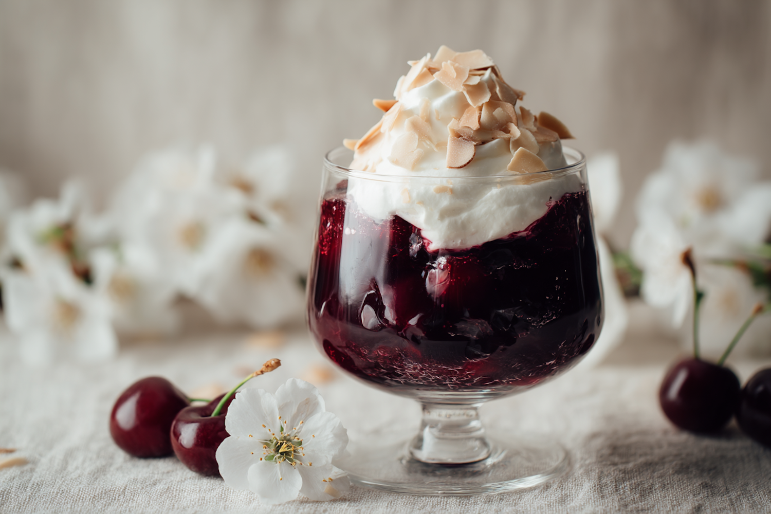 Elegant cherry dessert with compote, whipped cream, and toasted almonds, served in a glass with floral and cherry garnishes.