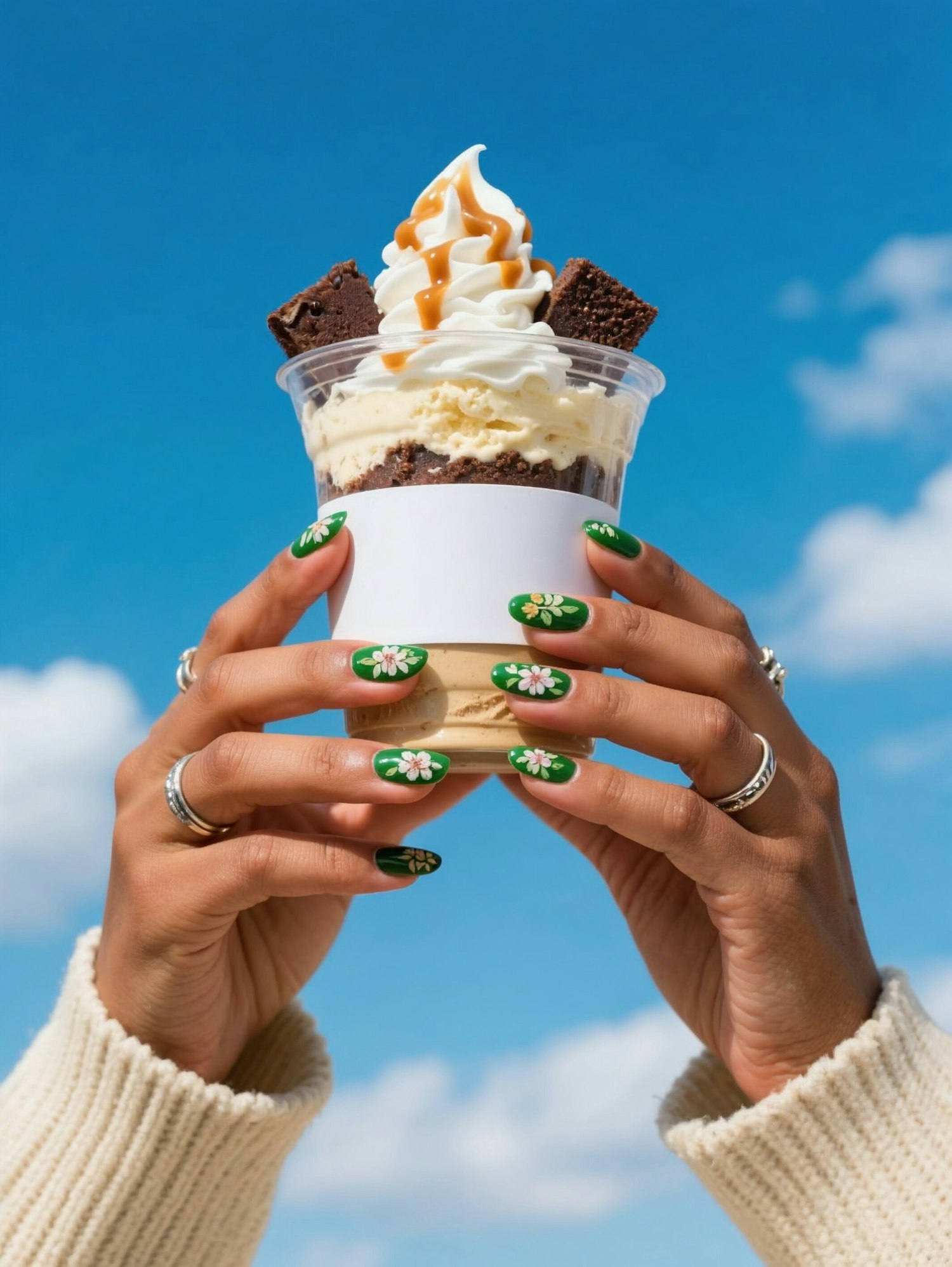 Hands with daisy nail art hold a dessert cup with ice cream, brownies, and caramel, set against a bright blue sky with clouds.