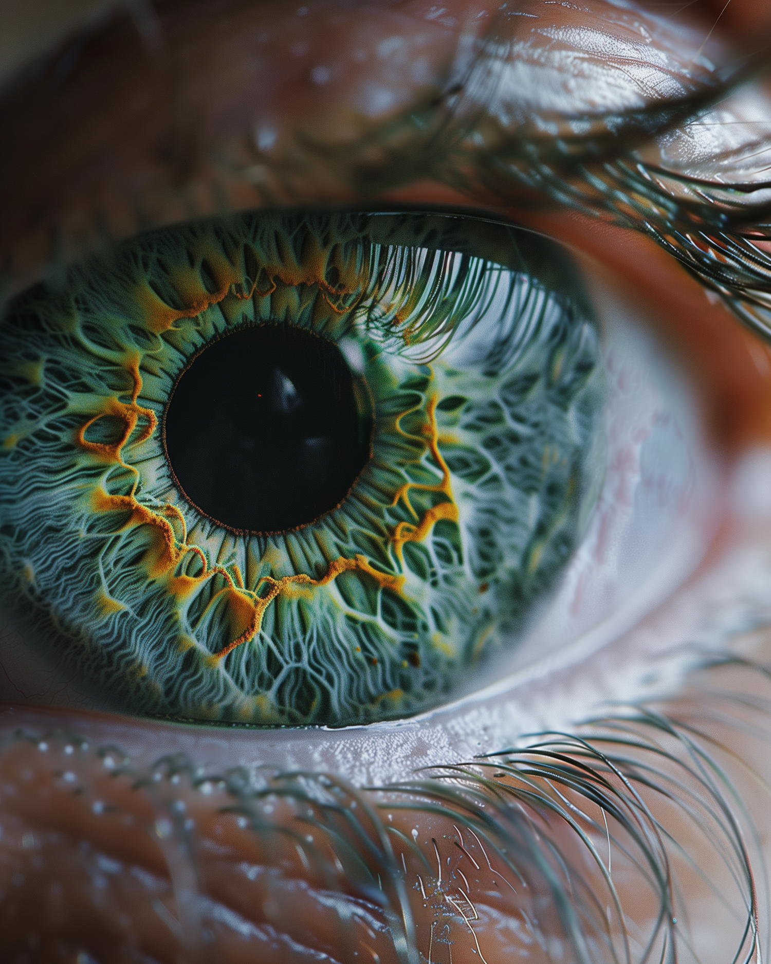 Stunning close-up of a human eye with intricate iris details in green and yellow hues, showcasing natural beauty and complexity.