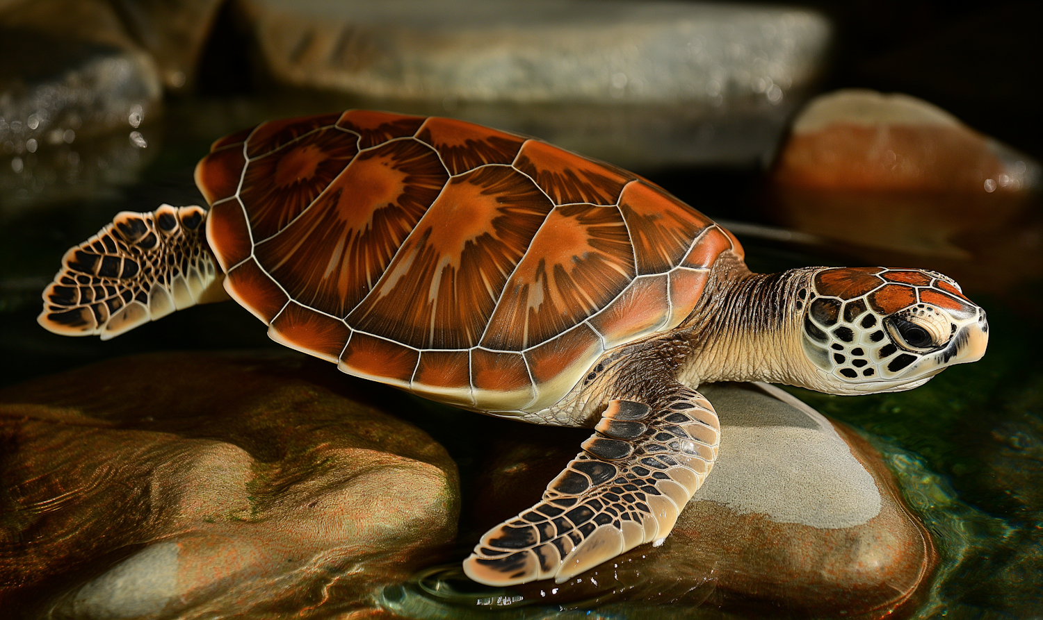 A sea turtle with a vibrant shell rests on a rock in clear water, showcasing intricate patterns and colors.