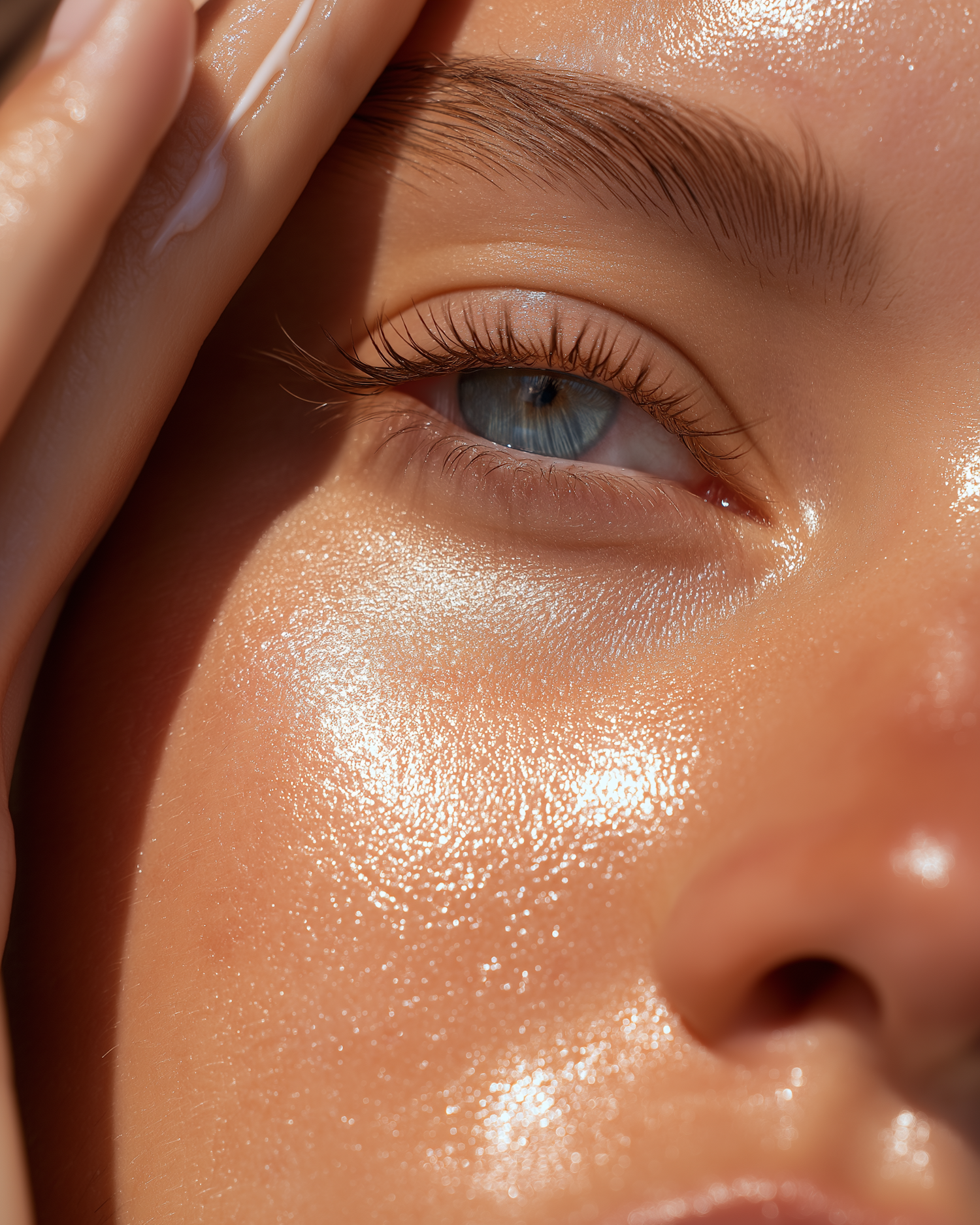 Close-up of a glowing and hydrated face focusing on a blue eye, emphasizing its clarity, skin radiance, and vibrant details.