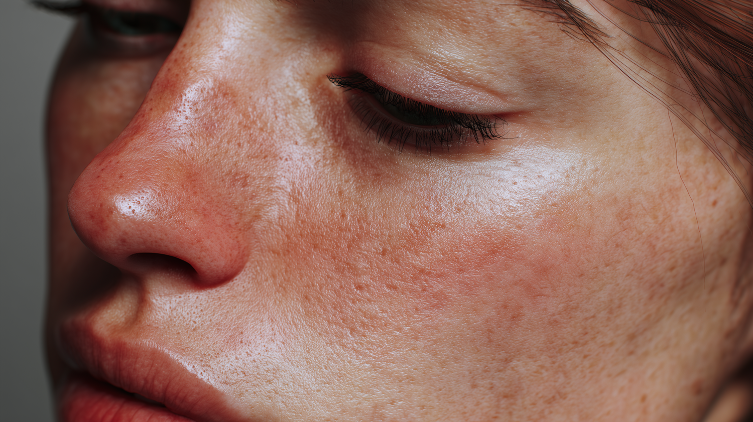Close-up of a human face showing detailed skin texture, freckles, and natural features with a focus on the nose and cheek area.