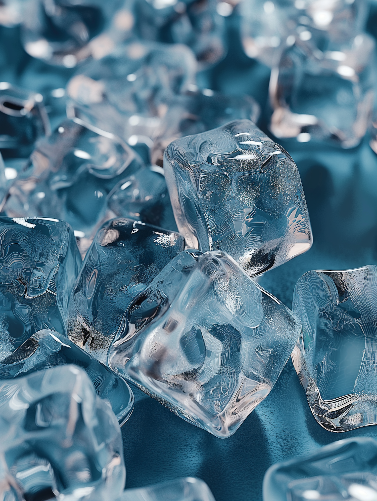 Close-up of clear ice cubes on a blue surface, showcasing intricate textures and reflections.