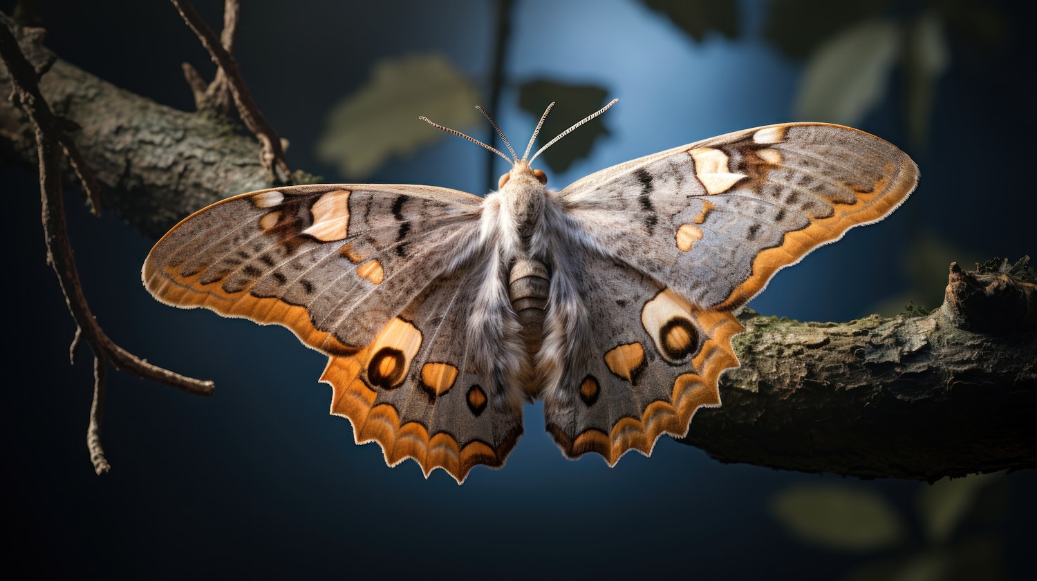 Stunning moth with orange and black patterns on gray wings, resting on a branch against a blurred natural background.