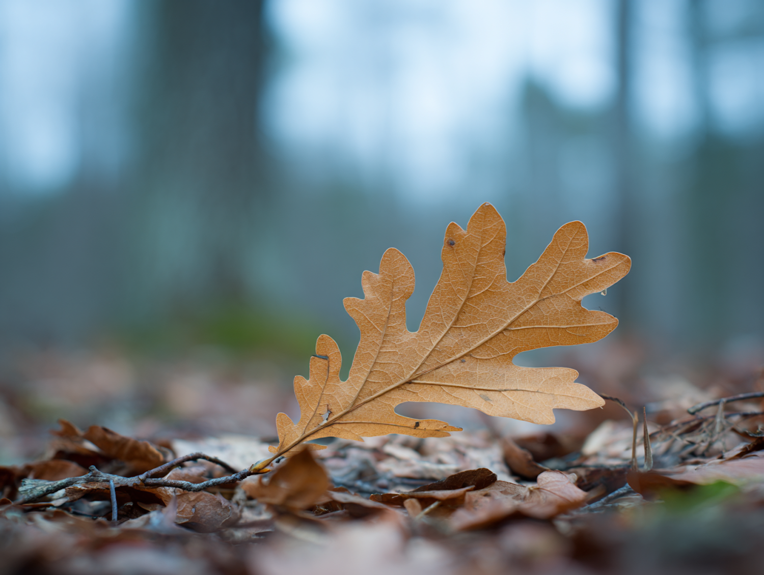 A single brown oak leaf resting among twigs and leaves, with a serene, blurred natural background lending an autumn vibe.