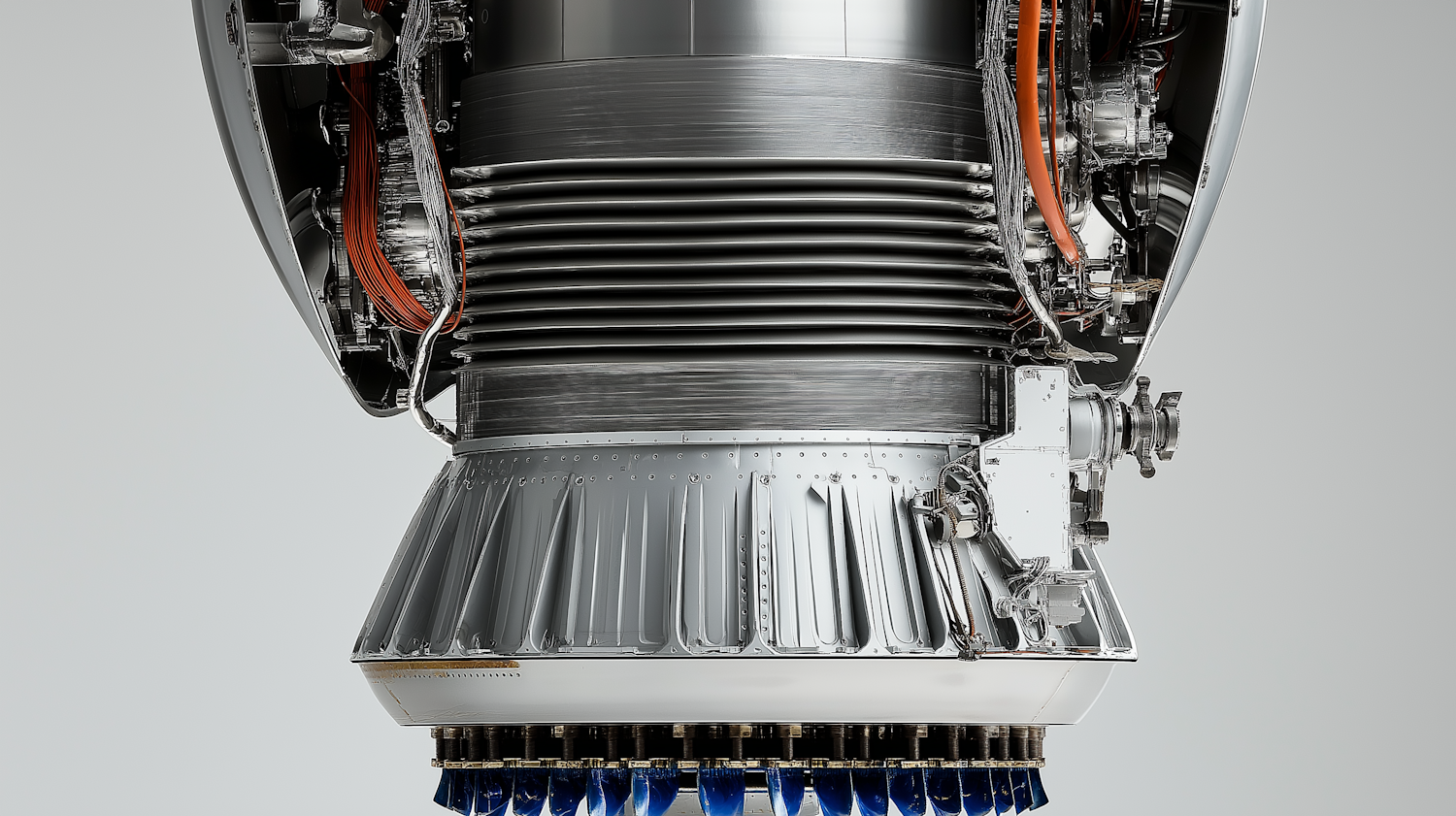 Detailed close-up of a rocket engine with metallic ribs, orange wiring, and blue nozzles, showcasing intricate engineering and design.
