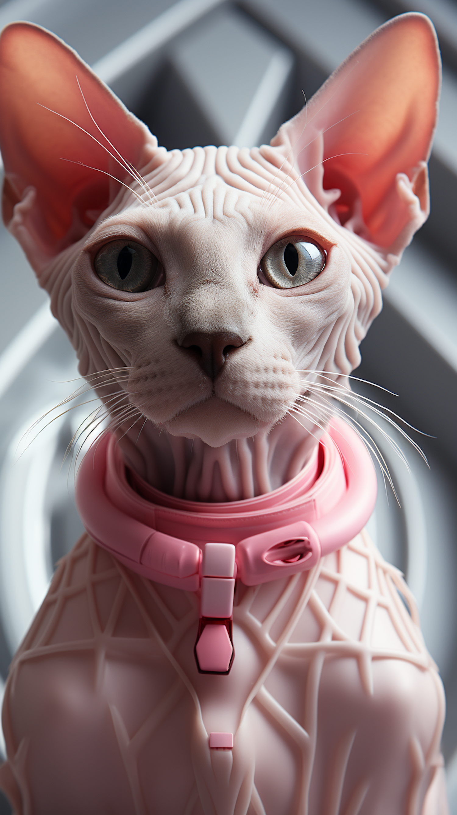 Close-up of a Sphynx cat with green eyes and a pink collar, showcasing its unique hairless skin and striking features.