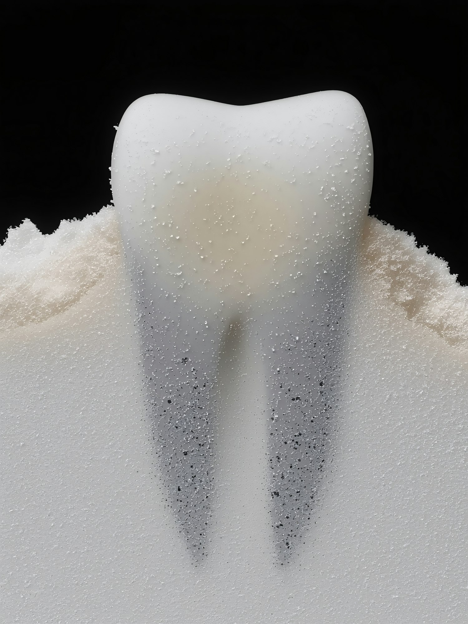 Close-up of a tooth with detailed texture, showing enamel, roots, and granular particles, set against a black background.