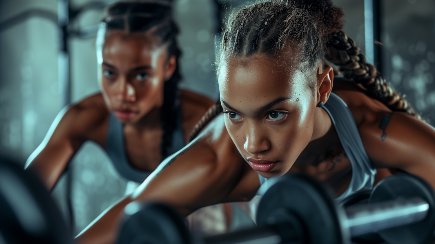 Two women with braided hair intensely focused on a workout, gripping dumbbells in a gym setting, showcasing strength and determination.