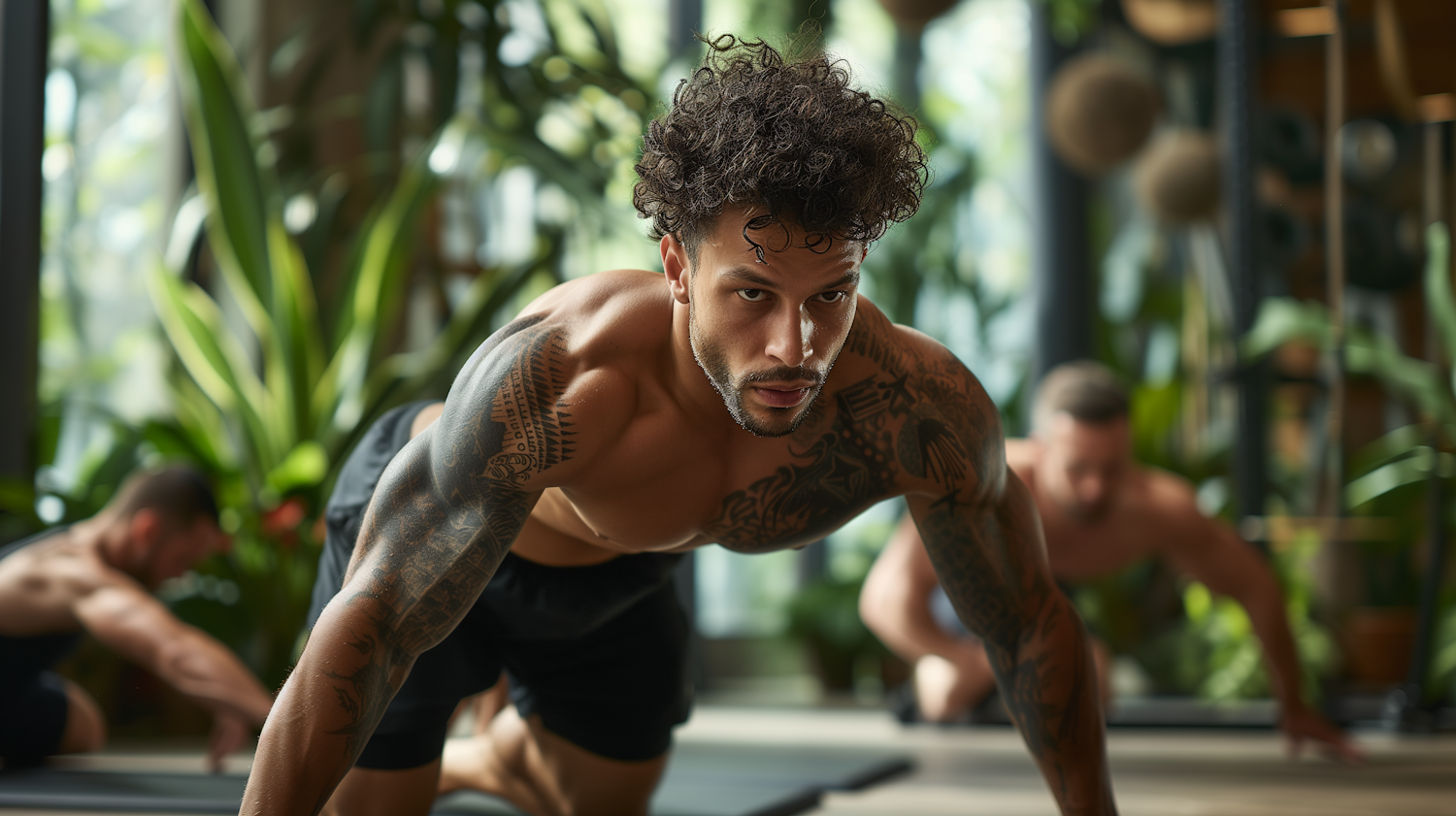 Muscular man with tattoos doing push-ups in a plant-filled gym, showcasing strength and focus.