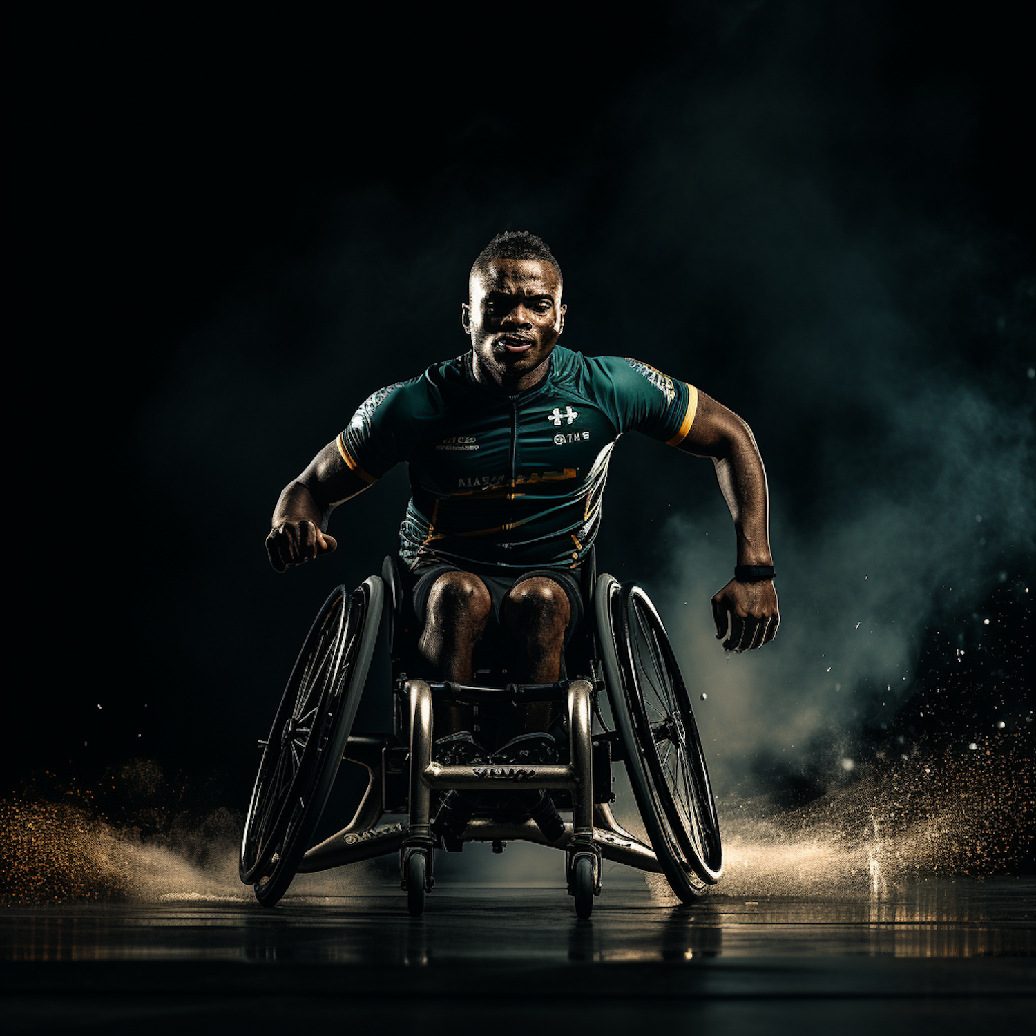 Dynamic shot of a determined athlete in a wheelchair, showcasing speed and strength against a dramatic dark background.