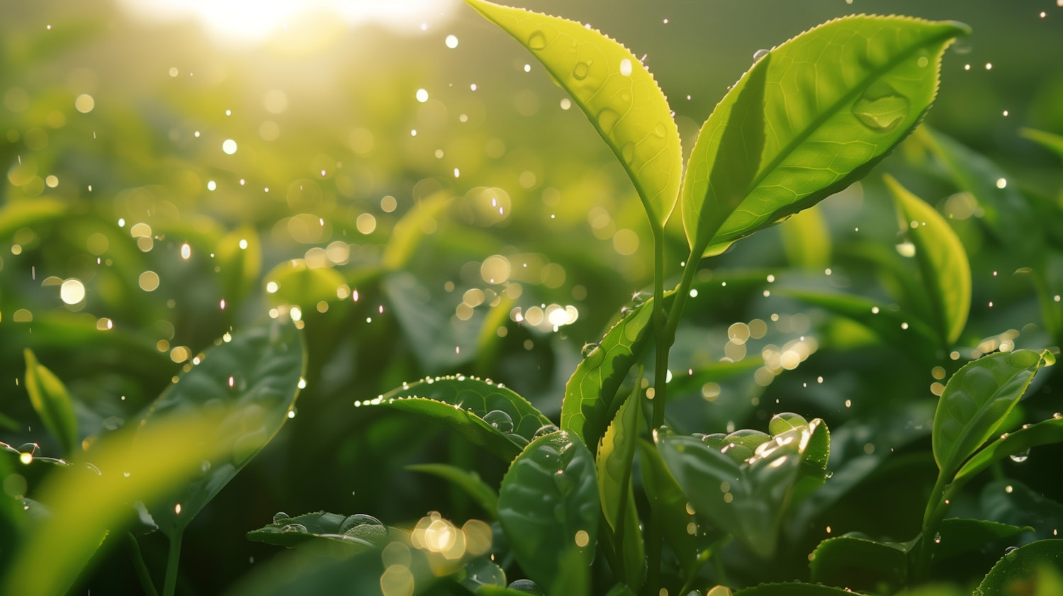 Close-up of dewy green leaves in sunlight, with sparkling water droplets and a serene, natural atmosphere.