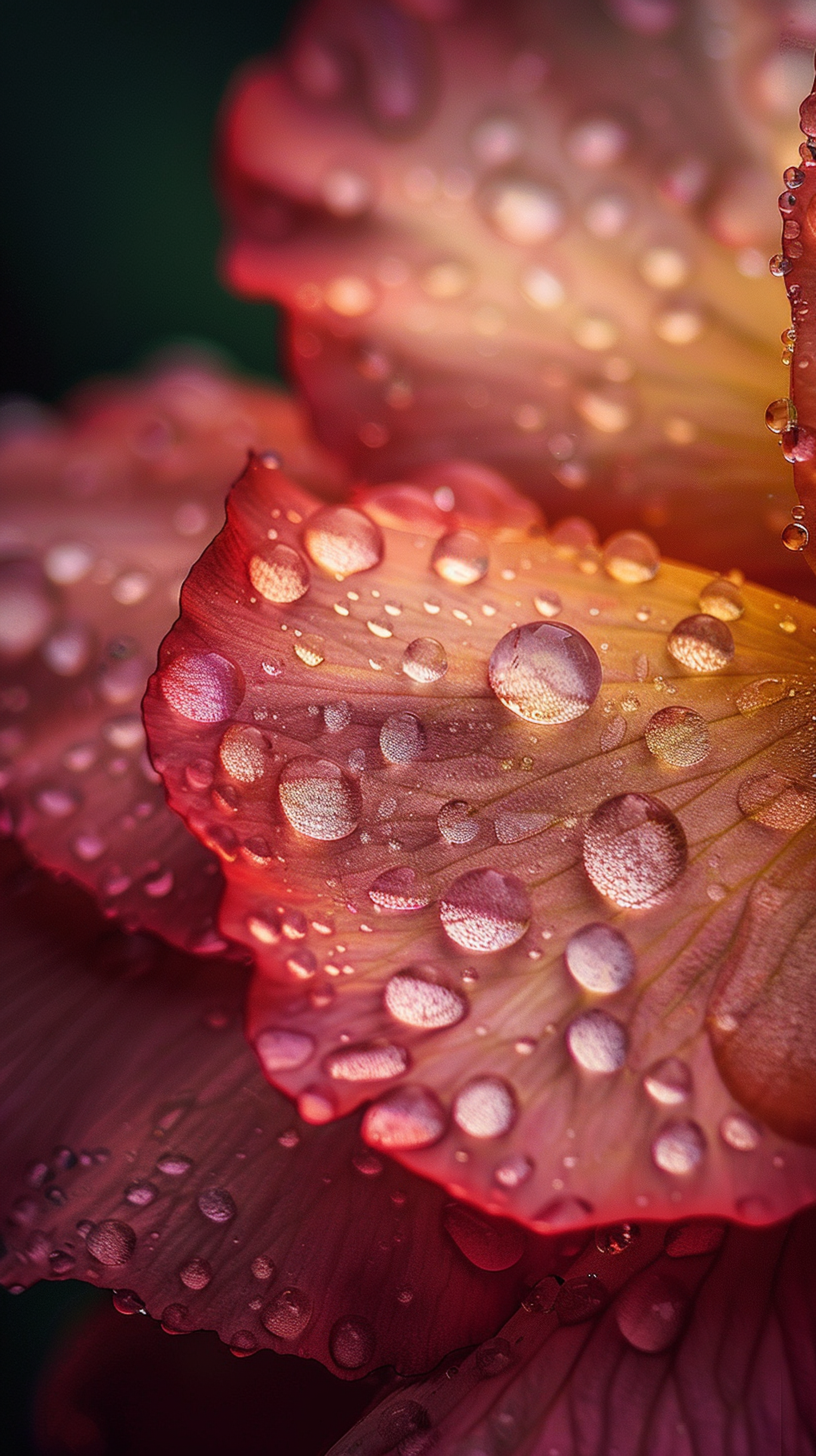 Close-up of a vibrant flower petal with water droplets, showcasing rich red and yellow hues and intricate textures.