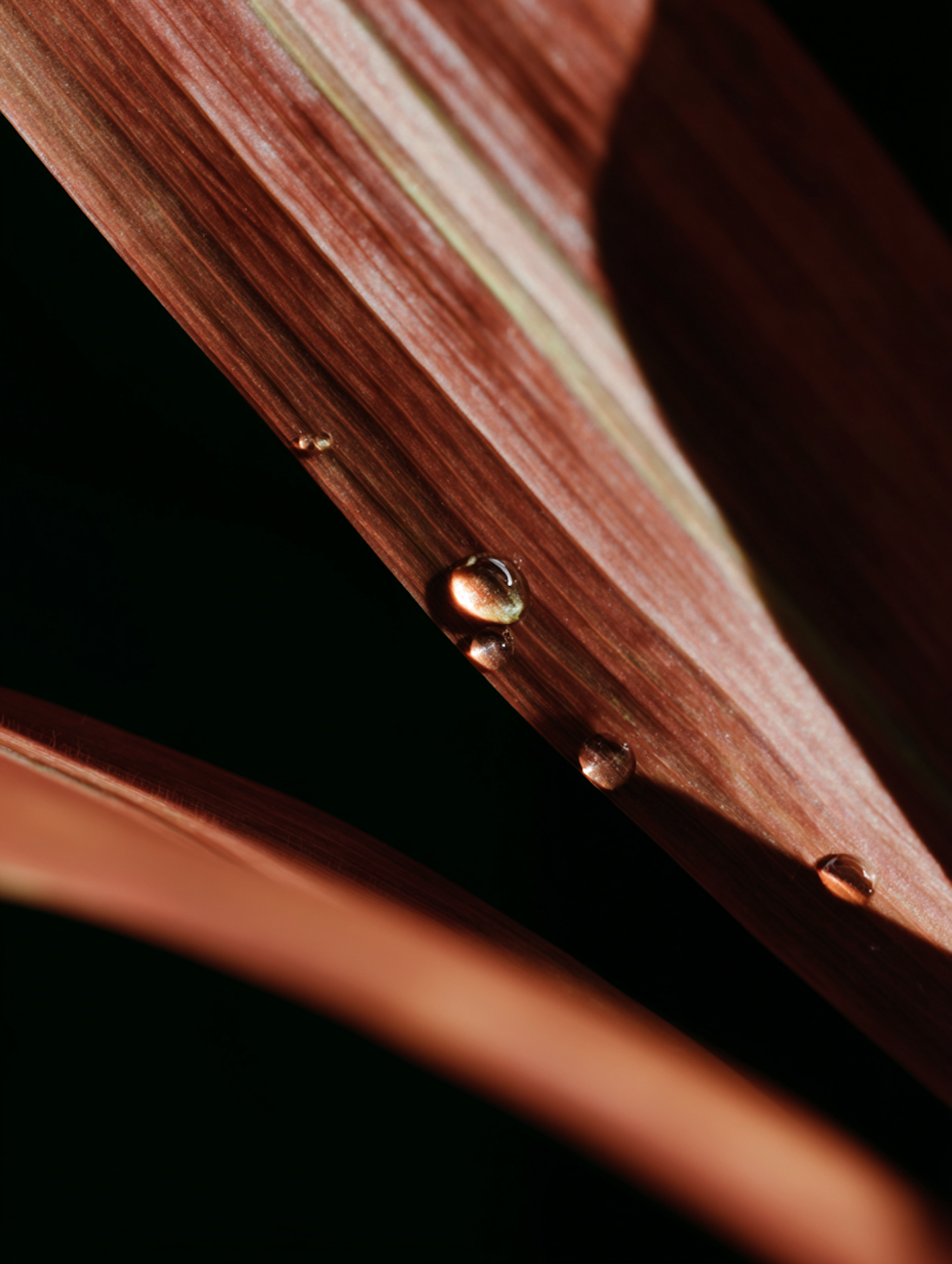 Close-up of a reddish-brown leaf with water droplets, showcasing intricate textures and a dark contrasting background.