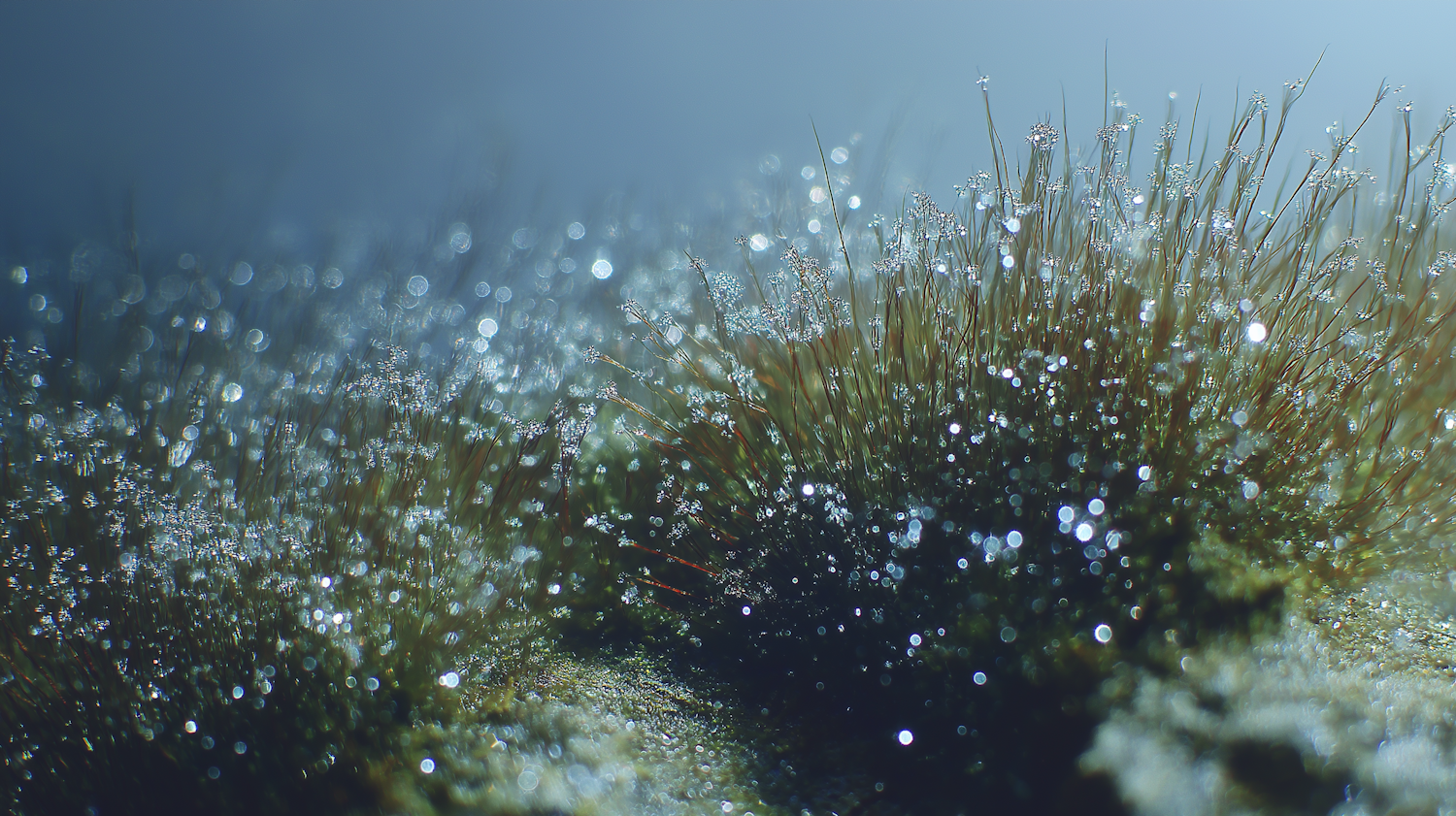 Close-up of moss with dew drops sparkling in soft light, creating a dreamy and serene natural scene.