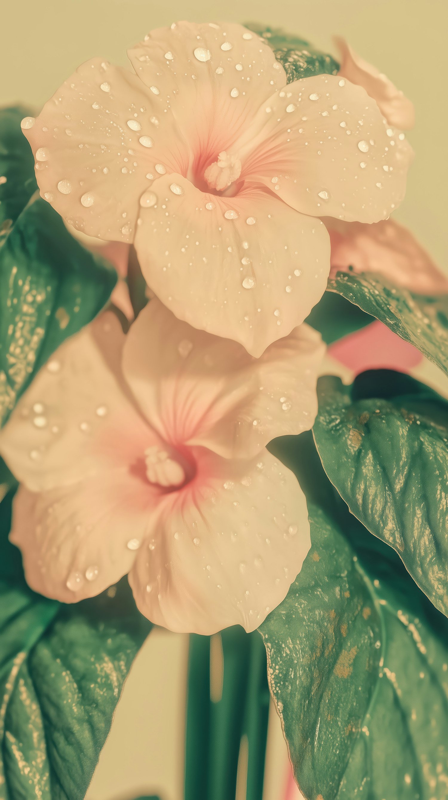 Close-up of pale pink flowers with water droplets and lush green leaves, set against a softly blurred background for a serene vibe.