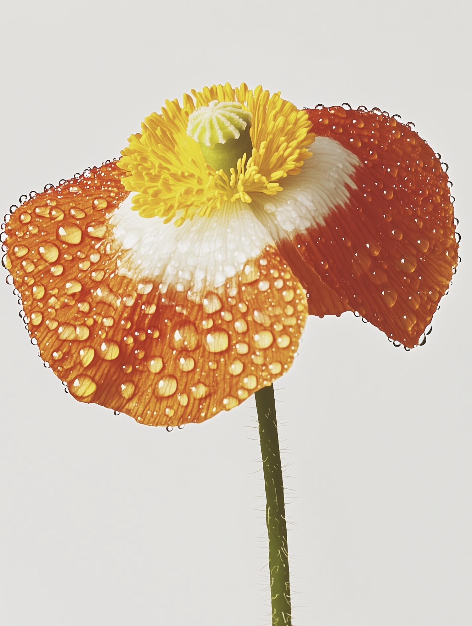 Close-up of a vibrant orange and white poppy with dewy petals and a bright yellow center, set against a soft, neutral background.