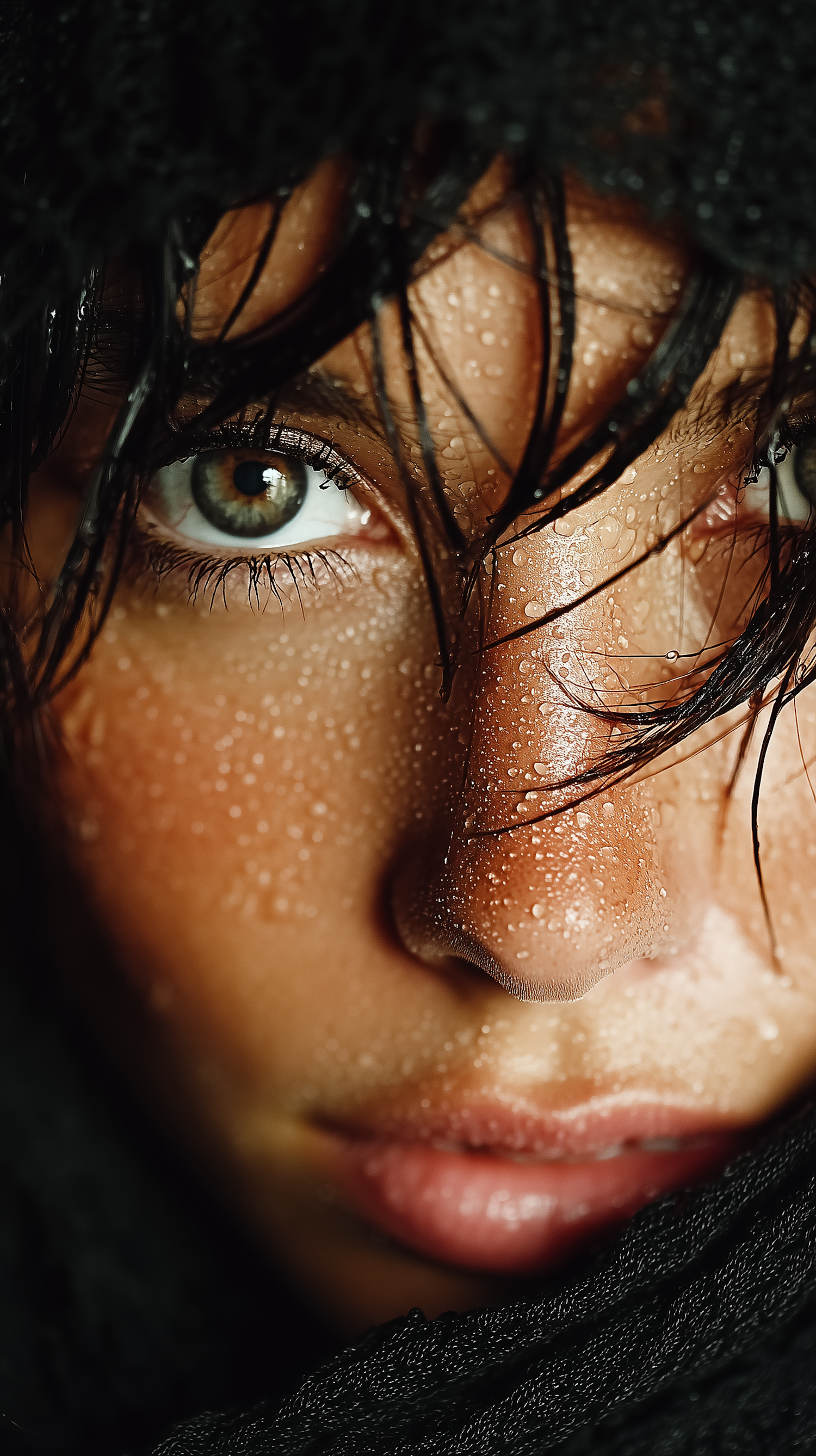 Close-up of a face with green eyes, wet black hair, and water droplets on skin, creating a dramatic and intimate portrait.