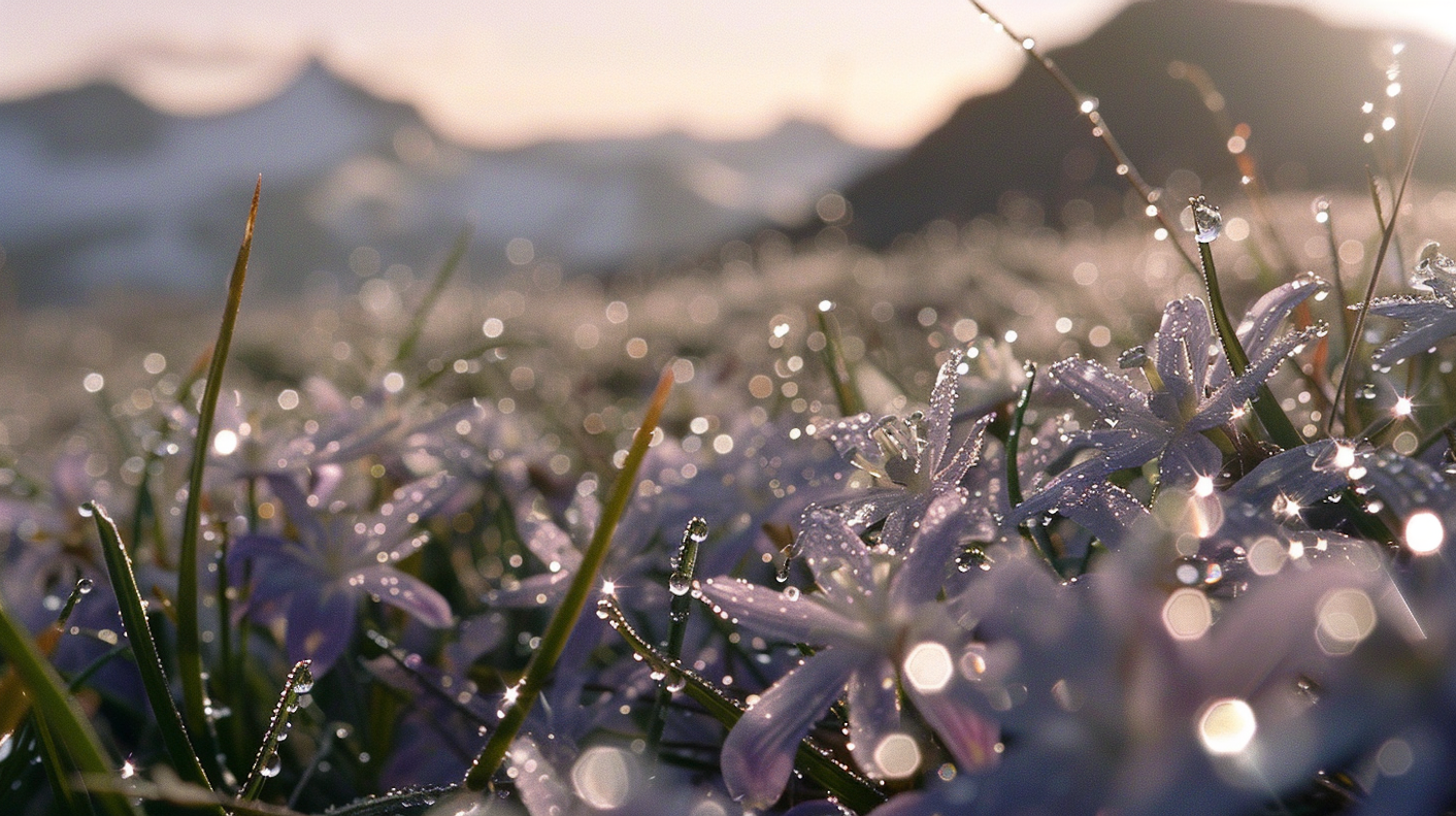 Close-up of dewy purple flowers and grass with a blurred mountain backdrop, capturing morning light and a serene, fresh atmosphere.