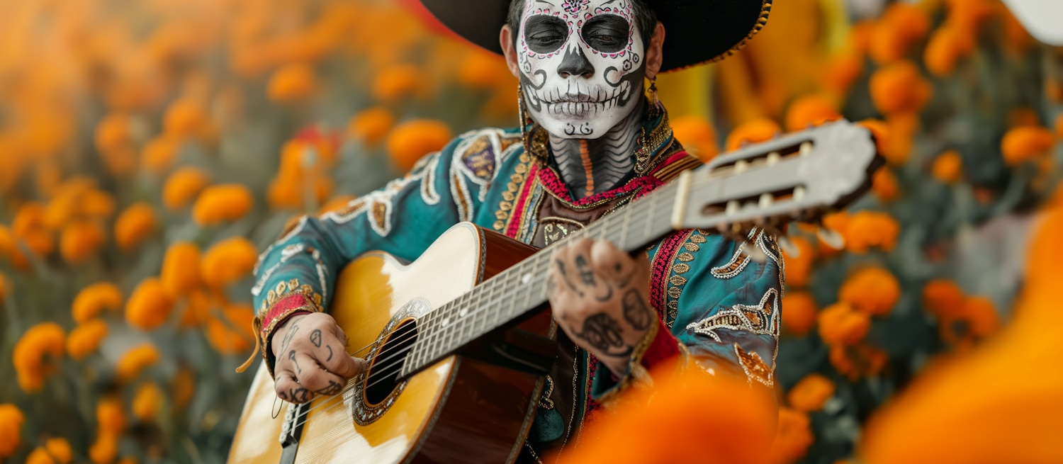 Day of the Dead celebration with a musician in traditional attire, playing guitar amidst vibrant marigold flowers.