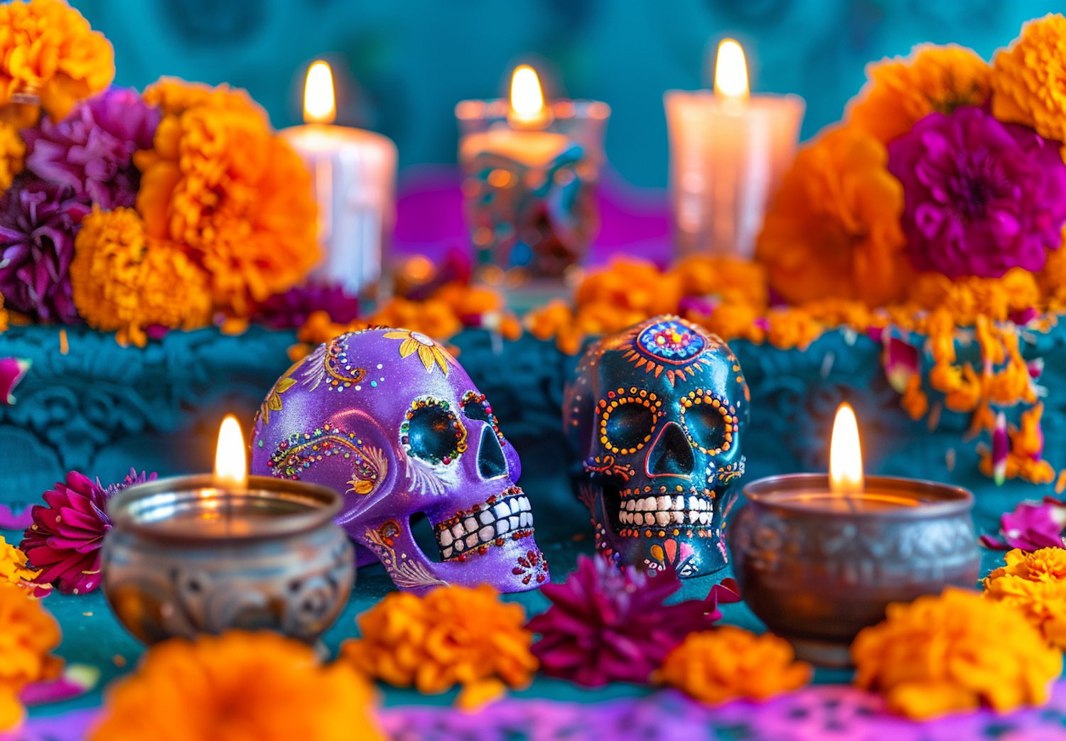Colorful Day of the Dead altar with decorated skulls, marigolds, and candles, celebrating Mexican tradition.