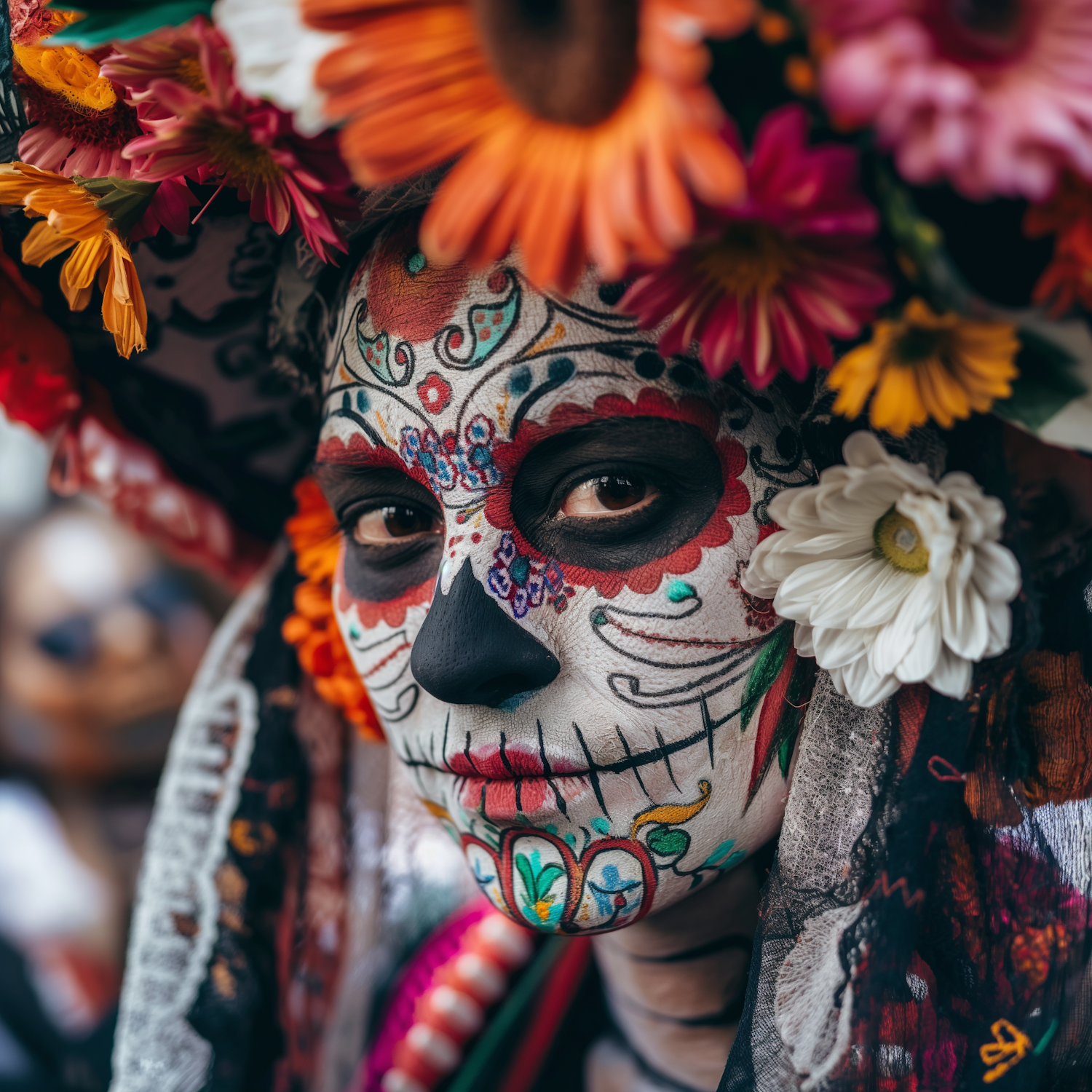 Vibrant Day of the Dead face paint with floral headdress, featuring intricate sugar skull designs and colorful flowers.