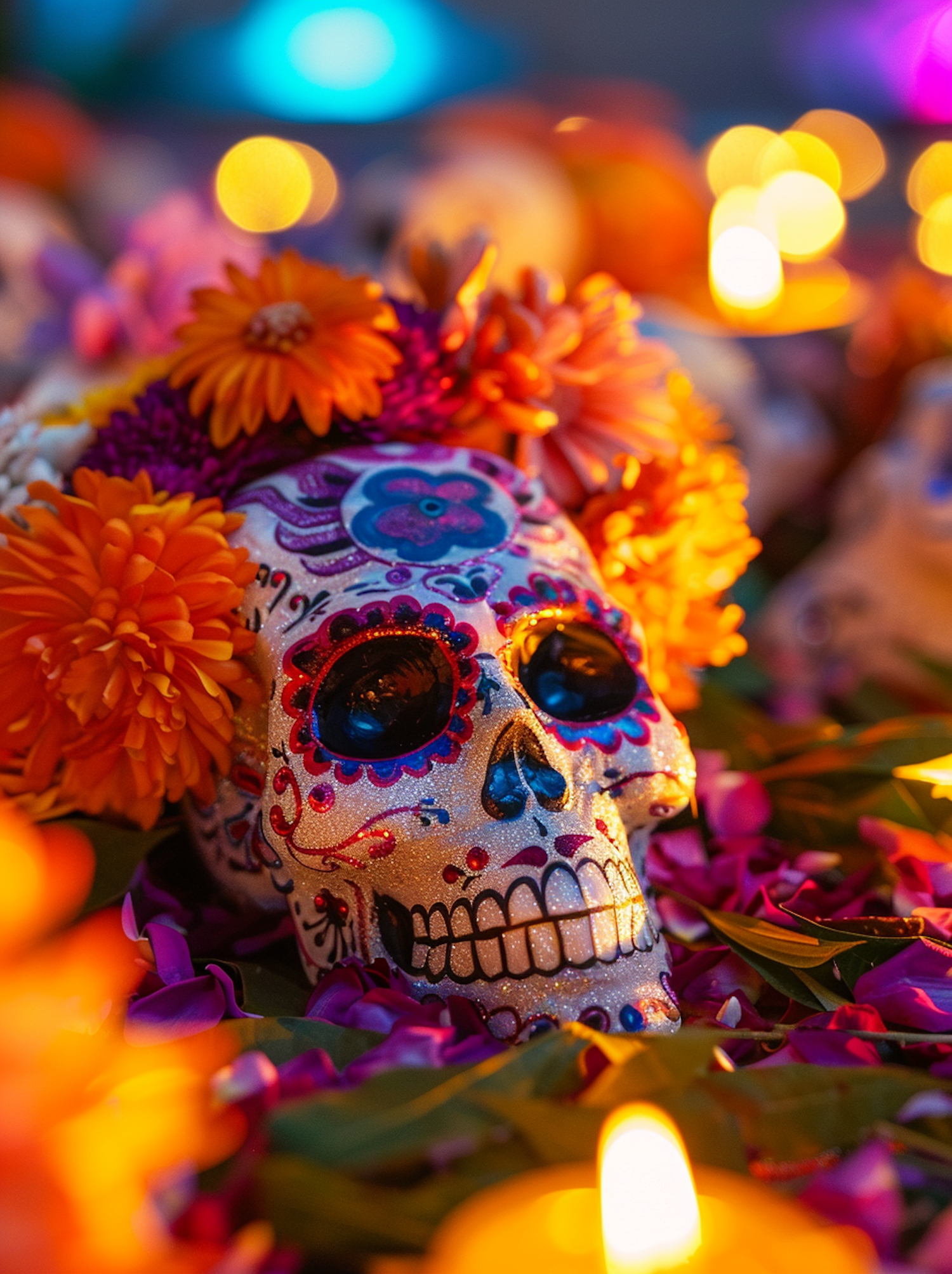 Colorful sugar skull with floral designs and marigolds, illuminated by candlelight, symbolizing Day of the Dead traditions.
