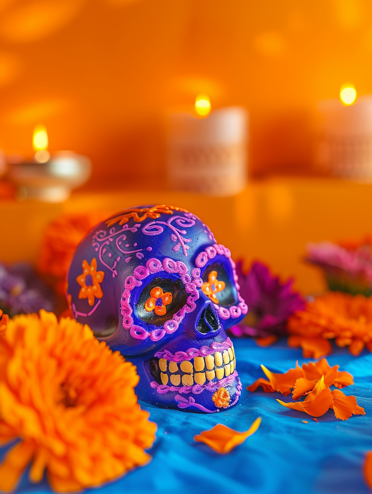 Colorful Day of the Dead skull with floral patterns, surrounded by marigolds and candles, creating a festive atmosphere.