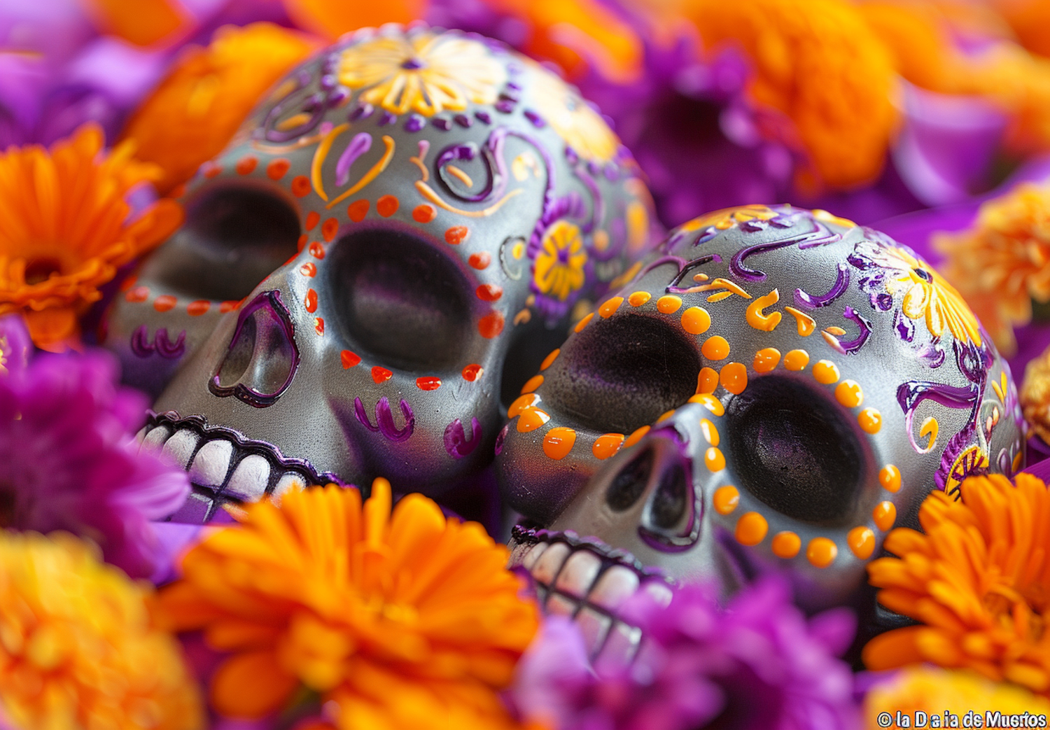 Vibrant sugar skulls with intricate designs surrounded by orange and purple marigolds, celebrating the Day of the Dead.