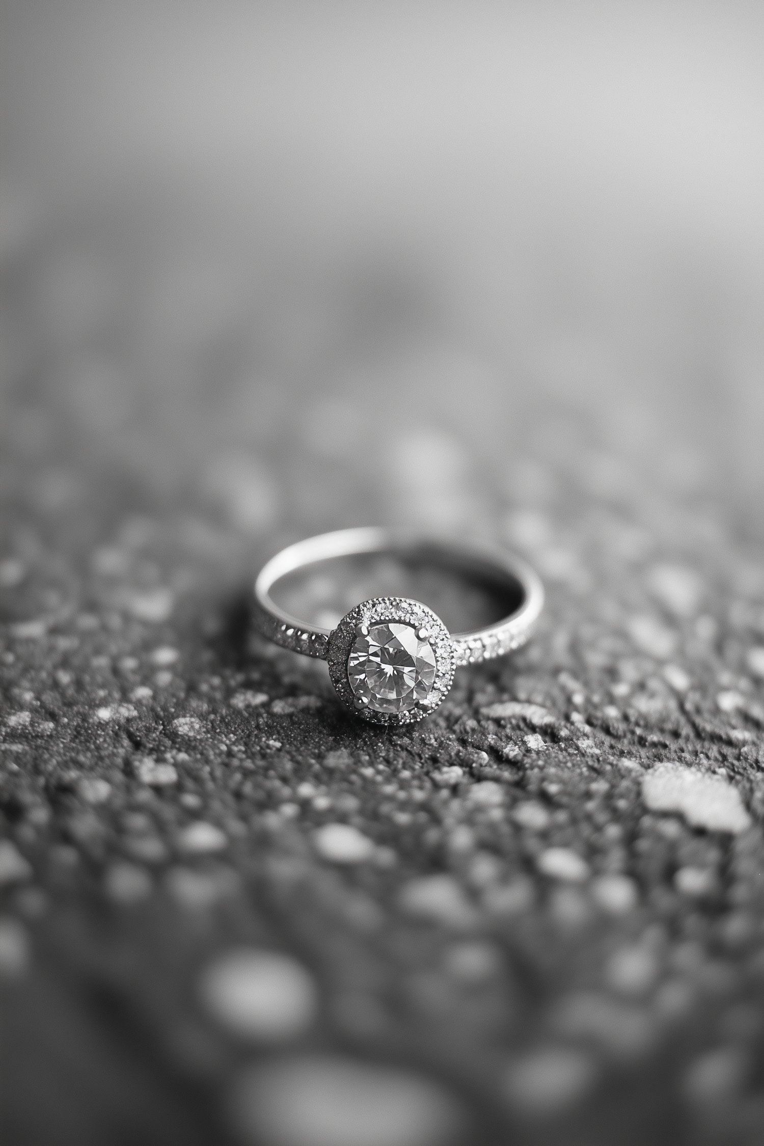 Elegant diamond ring with halo setting on textured surface, captured in black and white with a blurred background for dramatic effect.