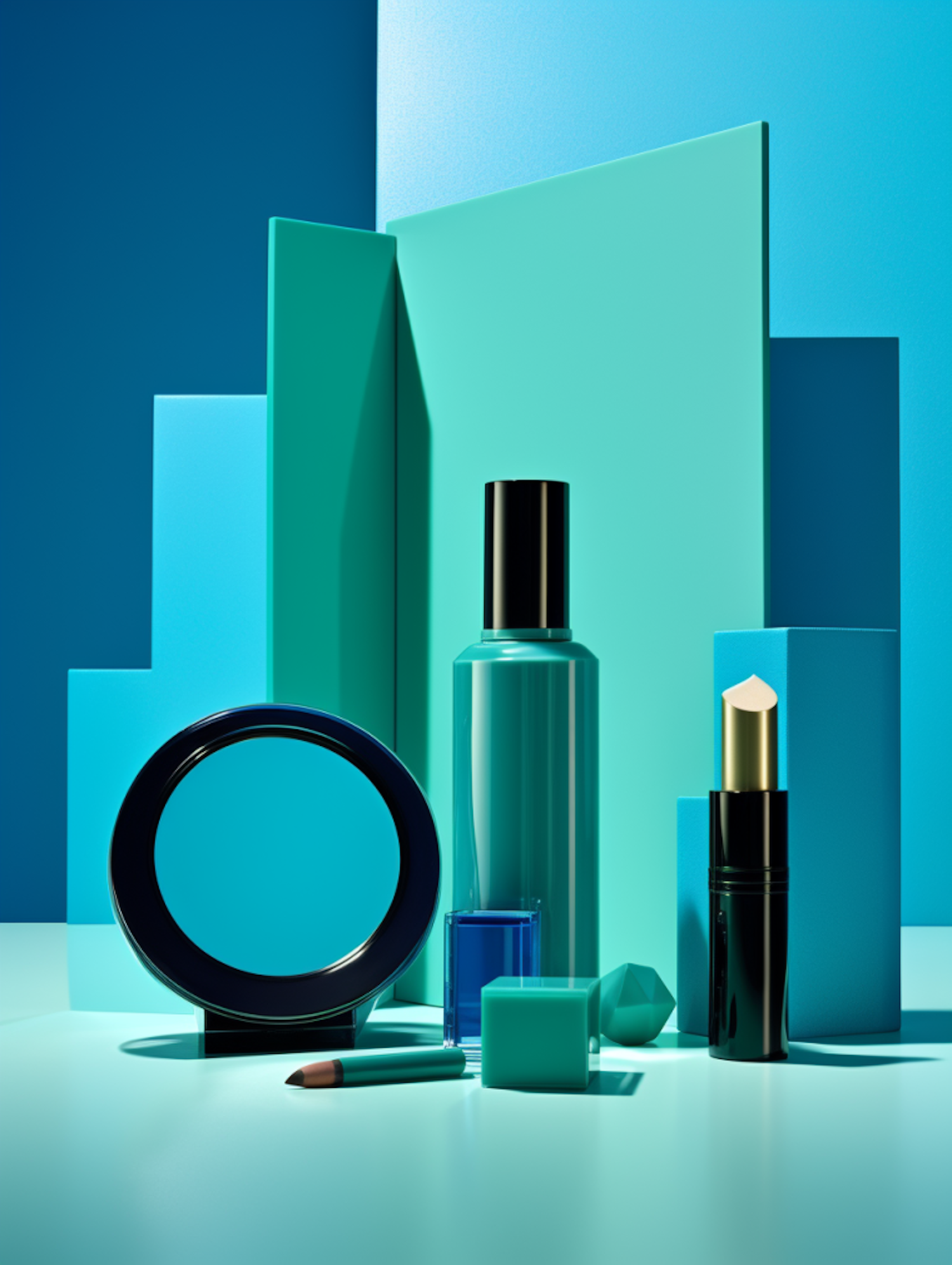 Stylish beauty products set against a geometric teal and blue backdrop, featuring lipstick, compact, and more.